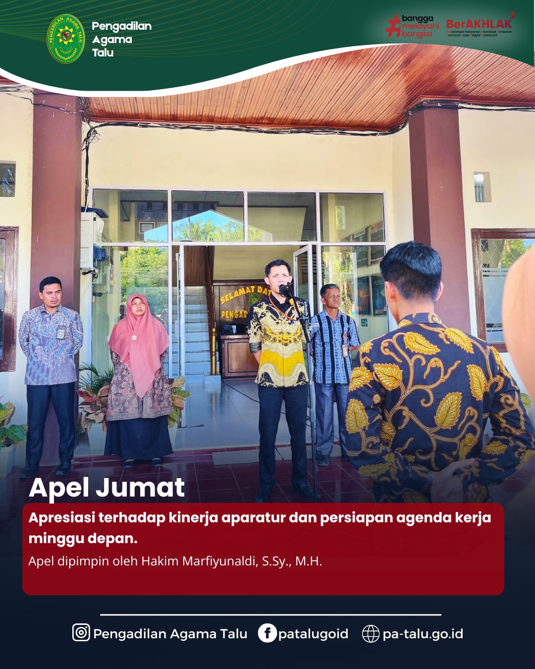 Selain itu, Marfiyunaldi juga memberikan perhatian pada aspek kesehatan para pegawai. Mengingat akan memasuki masa libur, ia mengimbau seluruh aparatur untuk menjaga kondisi fisik agar tetap prima sehingga dapat kembali bekerja dengan optimal pada pekan berikutnya. “Manfaatkan waktu libur untuk beristirahat dengan baik, menjaga kesehatan, dan kembali dengan semangat baru,” pesannya. Di akhir amanat, beliau menyampaikan apresiasi atas dedikasi dan kinerja seluruh aparatur selama sepekan terakhir. Ucapan terima kasih tersebut menjadi bentuk penghargaan atas kerja sama dan komitmen dalam memberikan pelayanan terbaik kepada masyarakat. Apel rutin ini tidak hanya menjadi sarana penyampaian informasi, tetapi juga momentum refleksi dan penguatan semangat kebersamaan di lingkungan Pengadilan Agama Talu.