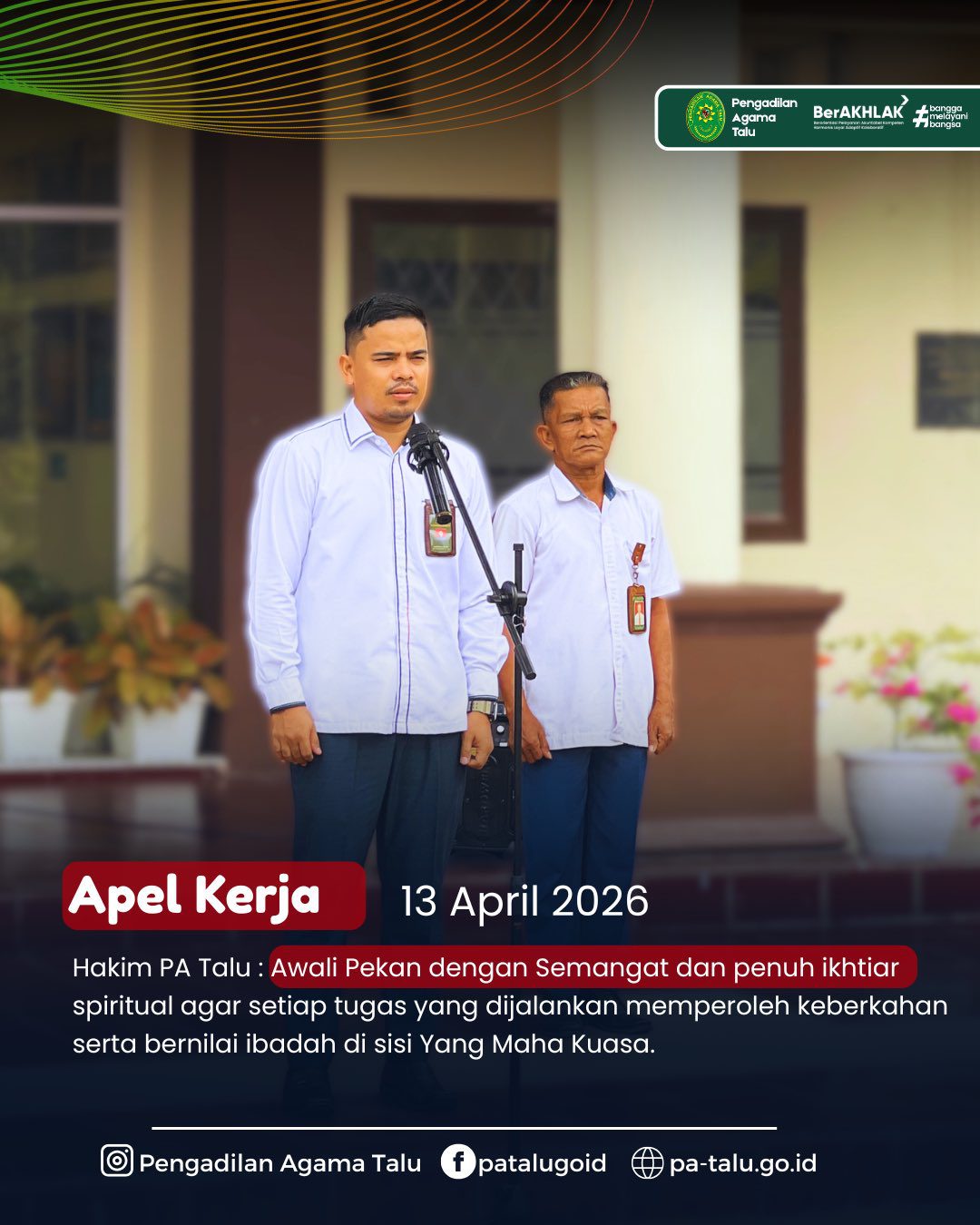 Apel pagi ini menjadi momentum untuk membangun semangat baru di awal pekan, memperkuat kebersamaan, serta menanamkan nilai-nilai spiritual dalam pelaksanaan tugas sehari-hari di lingkungan Pengadilan Agama Talu.