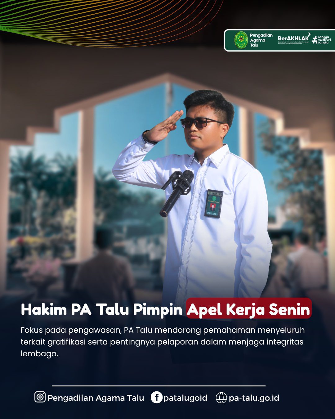 Simpang Empat — Pengadilan Agama Talu melaksanakan apel kerja pada Senin (20/04/2026) di halaman kantor PA Talu. Kegiatan tersebut dipimpin oleh Hakim Muhammad Rijaldy Alwy, S.H., LL.M., dan diikuti oleh seluruh aparatur. Dalam amanatnya, pembina apel menyampaikan pentingnya menindaklanjuti program prioritas Badilag Tahun 2026, khususnya pada aspek pengawasan melalui penguatan Zona Integritas. Salah satu fokus utama yang ditekankan adalah penerapan Sistem Manajemen Anti Penyuapan sebagai bagian dari upaya mewujudkan peradilan yang bersih dan berintegritas. Selaku Koordinator Zona Integritas bidang pengawasan, beliau mengajak seluruh aparatur untuk bersama-sama membangun kesadaran dan pemahaman terkait gratifikasi. Hal ini sejalan dengan ketentuan dalam Peraturan KPK Nomor 1 Tahun 2026, khususnya mengenai langkah-langkah yang harus dilakukan apabila menerima pemberian dalam bentuk apapun. “Jika terdapat keraguan atau kebingungan dalam menyikapi hal tersebut, agar tidak segan untuk melaporkannya sesuai mekanisme yang berlaku,” tegasnya.