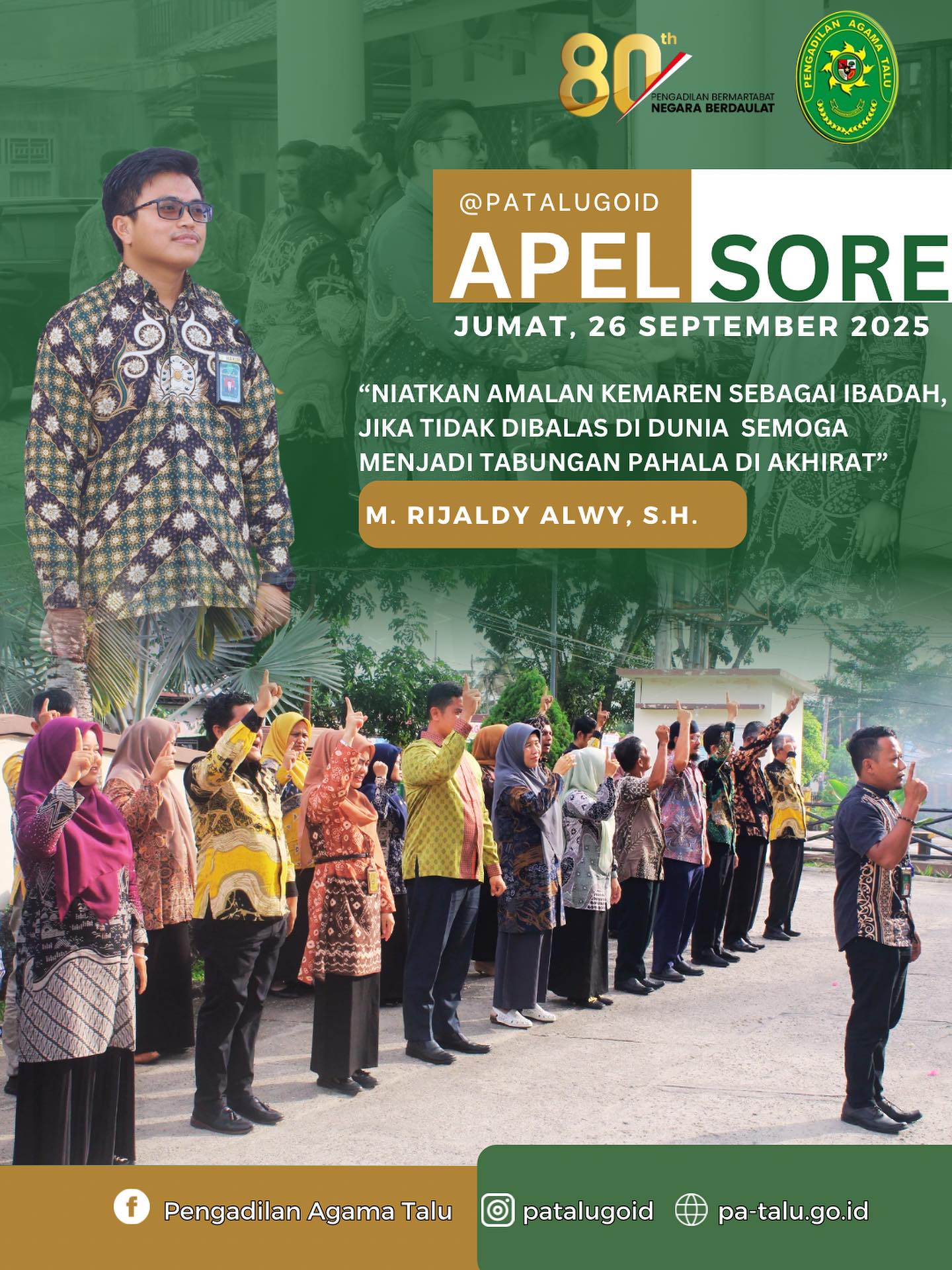Di penghujung hari kerja pekan ini, Pengadilan Agama (PA) Talu menggelar apel sore di halaman kantor. Apel yang dipimpin oleh Hakim Muhammad Rijaldy Alwy, S.H. ini menjadi momen untuk mengevaluasi kinerja dan memotivasi seluruh jajaran.