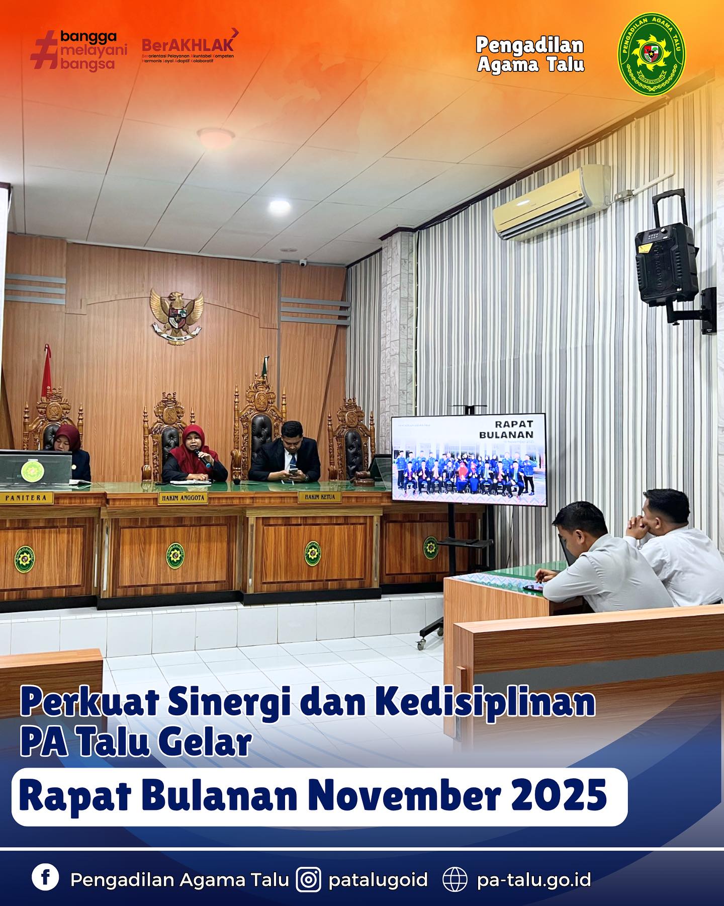Pengadilan Agama (PA) Talu kembali menggelar Rapat Bulanan periode November 2025 dengan fokus utama pada peningkatan disiplin kerja dan evaluasi kinerja. Rapat yang dihadiri oleh seluruh Hakim dan aparatur PA Talu ini dilangsungkan dengan khidmat di Ruang Sidang Utama PA Talu, Senin (10/11).