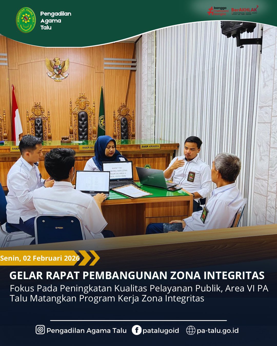 Pengadilan Agama Talu melalui Area VI ZI menggelar rapat pada Senin, 02 Februari 2026 di Ruang Sidang Abu Musa Al Asyari, yang dipimpin oleh koordinator area Bapak Robbil Alfires S.Sy., M.H.,. Rapat ini dihadiri oleh seluruh anggota Area VI ZI Pengadilan Agama Talu. Tujuan utama dari area ini adalah memberikan pelayanan yang lebih cepat, aman, dan mudah diakses oleh masyarakat guna mewujudkan predikat Wilayah Bebas dari Korupsi (WBK) dan Wilayah Birokrasi Bersih dan Melayani (WBBM). Selain itu Area VI juga berfokus pada melakukan penilaian berkala melalui Survei Kepuasan Masyarakat (SKM) untuk mengevaluasi kualitas layanan.