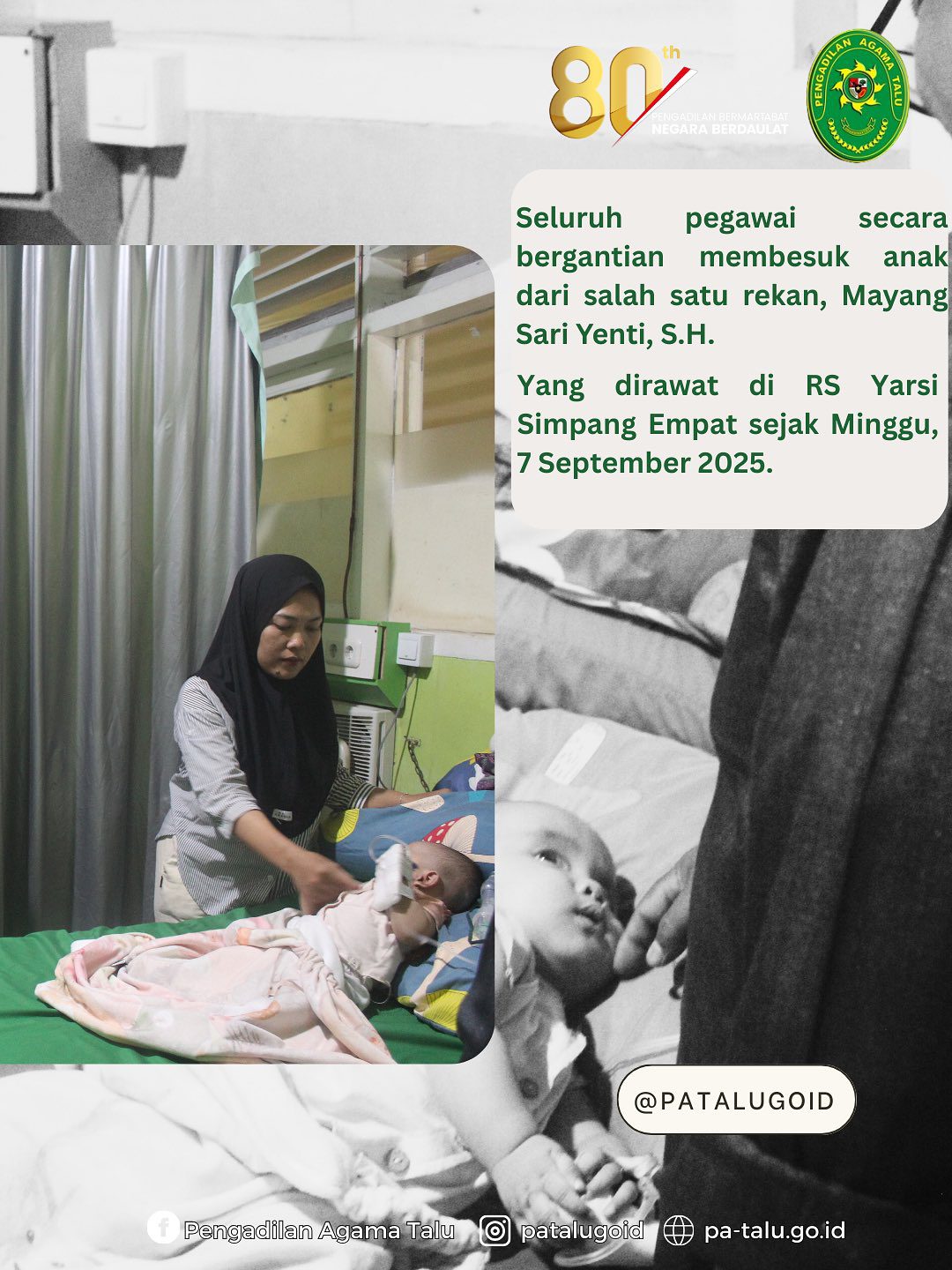 Ketua PA Talu, Milda Sukmawati, S.H.I., turut hadir secara langsung. Dalam kunjungannya, beliau tidak hanya memberikan doa untuk kesembuhan sang anak, tetapi juga memberikan dukungan penuh kepada Mayang Sari agar tetap kuat dan semangat. Turut hadir Para Hakim, Sekretaris PA Talu Nurmatias, S.Ag. Beserta Panitera Muda Permohonan Hj.Isterliza, S. Ag.