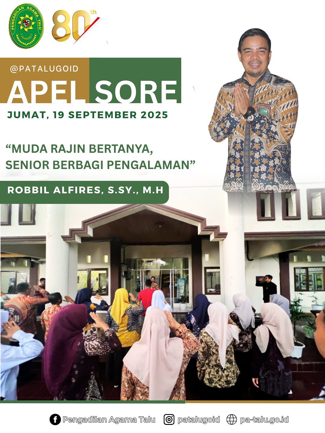 Rangkaian kegiatan hari Jumat ditutup dengan apel sore yang dipimpin oleh Hakim Robbil Alfires, S.Sy., M.H. Dalam amanatnya, beliau menyoroti pentingnya kolaborasi dan sinergi antarpegawai sebagai kunci kemajuan PA Talu.