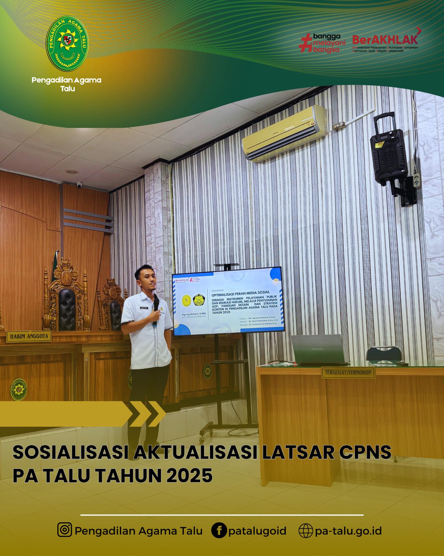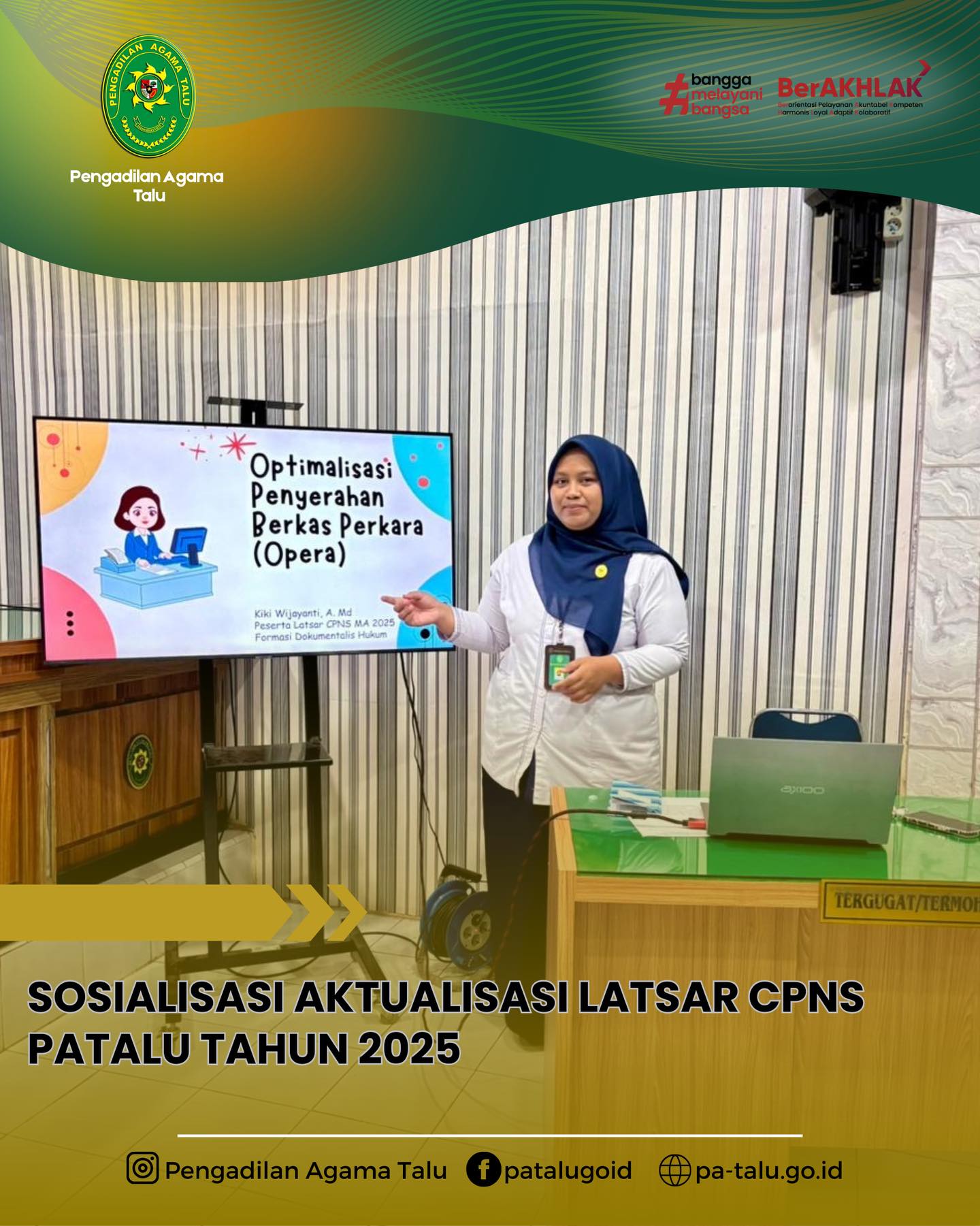Senin, 15 Desember 2025, telah dilaksanakan kegiatan Sosialisasi Aktualisasi Pelatihan Dasar (Latsar) CPNS oleh tiga orang pegawai CPNS Pengadilan Agama Talu. Kegiatan ini merupakan bagian dari tahapan aktualisasi nilai-nilai dasar ASN dalam rangka peningkatan kualitas pelayanan dan tata kelola administrasi peradilan. Kegiatan sosialisasi ini dihadiri oleh Ketua Pengadilan Agama Talu, Ibu Milda Sukmawati, S.H.I., serta Panitera Pengadilan Agama Talu selaku Mentor Latsar CPNS, Bapak Dr. Roni Pebrianto, S.H.I., M.H. Kehadiran pimpinan dan mentor serta pengawai Pengadilan Agama Talu memberikan dukungan serta arahan terhadap inovasi yang dipaparkan oleh para peserta Latsar CPNS.