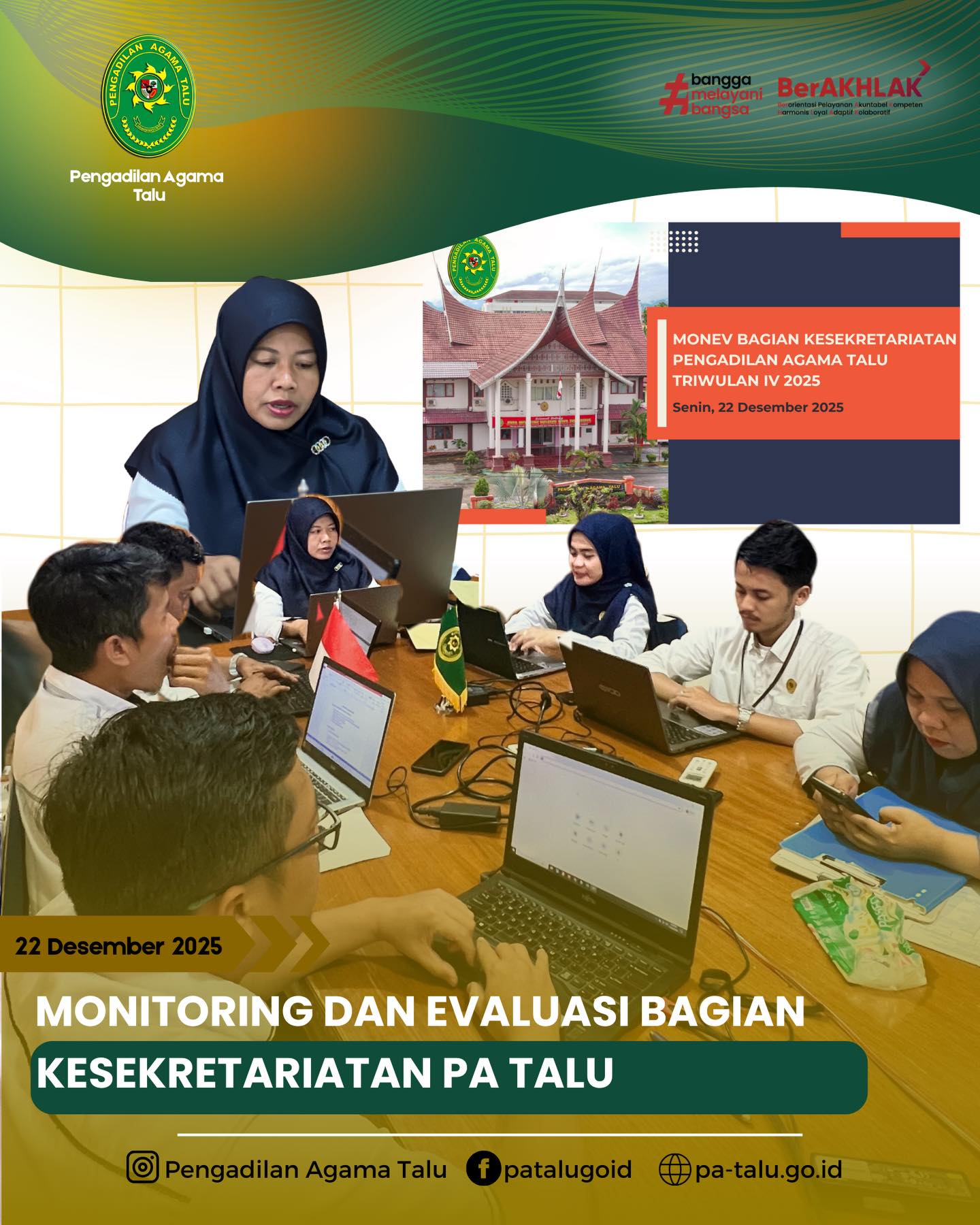Bagian Kesekretariatan Pengadilan Agama (PA) Talu melaksanakan Rapat Monitoring dan Evaluasi (Monev) Triwulan IV sebagai bentuk pengawasan dan penilaian terhadap pelaksanaan program kerja serta capaian kinerja di Triwulan IV 2025. Rapat yang dilaksanakan di Media Center PA Talu dipimpin langsung oleh Sekretaris Adriyeni, SH Kasubag Kepegawaian Yoga Yanova, S.Kom, Analis Keuangan Diqki Aulia, S.Kom serta seluruh pegawai bagian Kesekretariatan.