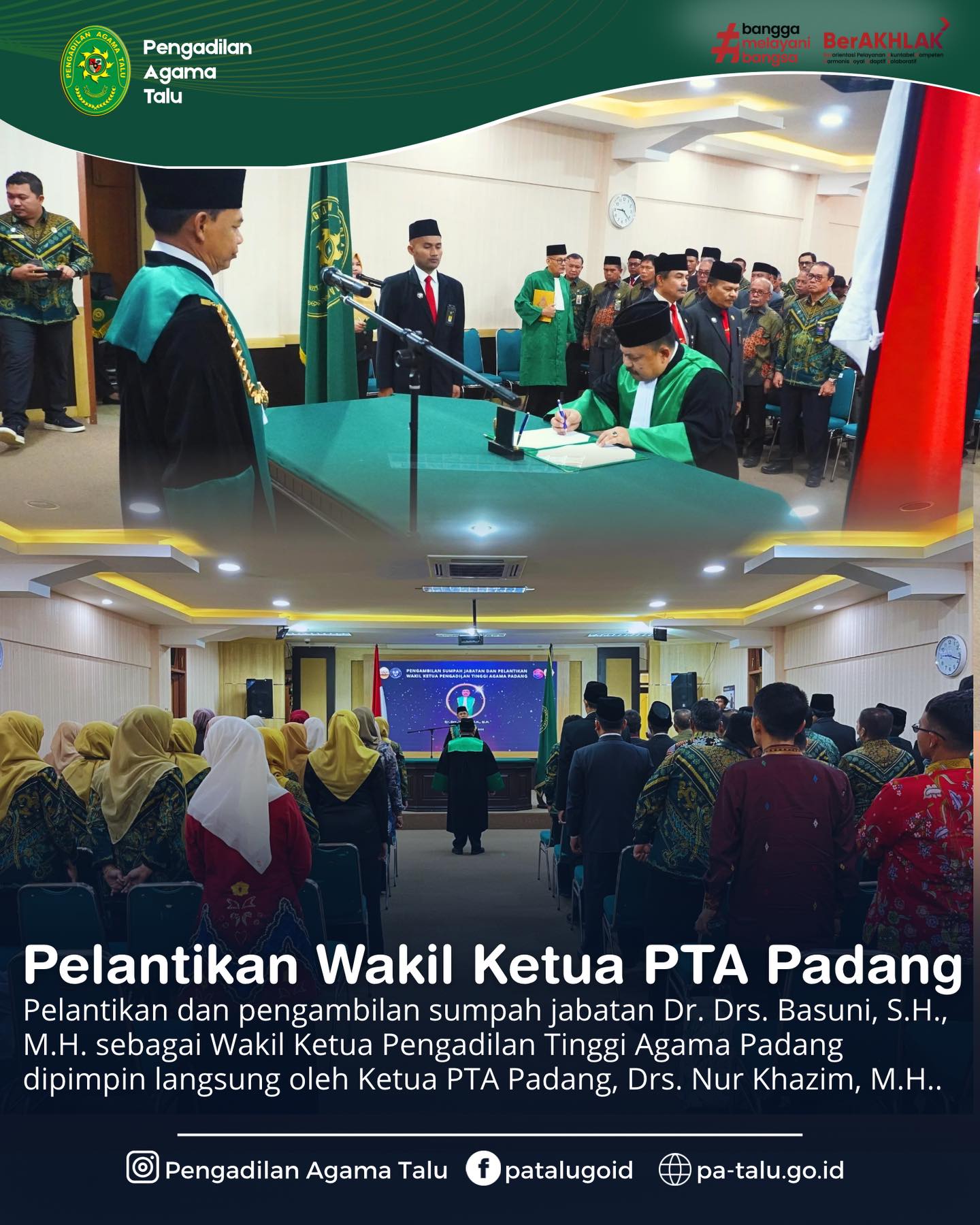 Ketua Pengadilan Agama Talu, Milda Sukmawati, S.H.I., mengikuti kegiatan Pelantikan Wakil Ketua Pengadilan Tinggi Agama (PTA) Padang yang diselenggarakan di Command Center PTA Padang. Kegiatan ini menjadi momentum penting dalam penguatan struktur kepemimpinan peradilan agama di wilayah Sumatera Barat. Dalam kesempatan tersebut, Ketua PA Talu hadir didampingi oleh Panitera Dr. Roni Pebrianto, S.H.I., M.H., serta Sekretaris Adriyeni, S.H. Prosesi pelantikan turut dihadiri oleh para pimpinan dan aparatur peradilan agama se-Sumatera Barat, mencerminkan soliditas dan sinergi antar satuan kerja di lingkungan peradilan agama. Prosesi pelantikan dan pengambilan sumpah jabatan Dr. Drs. Basuni, S.H., M.H. sebagai Wakil Ketua Pengadilan Tinggi Agama Padang dipimpin langsung oleh Ketua PTA Padang, Drs. Nur Khazim, M.H.. Acara berlangsung dengan khidmat, tertib, dan penuh makna sebagai simbol pengembanan amanah jabatan yang baru.