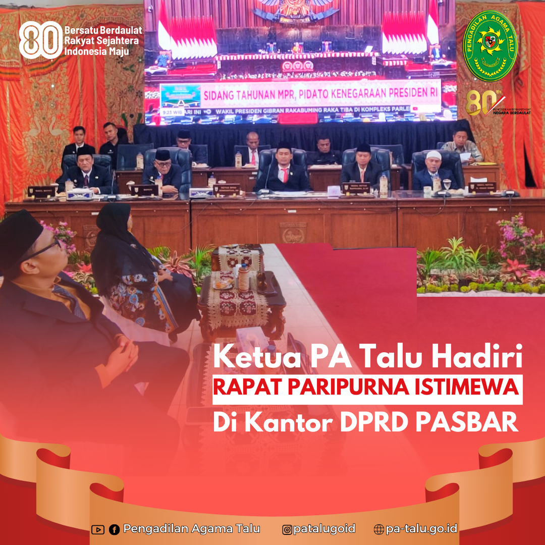 Ketua Pengadilan Agama (PA) Talu, Milda Sukmawati, S.H.I., menghadiri Rapat Paripurna Istimewa Dewan Perwakilan Rakyat Daerah (DPRD) Kabupaten Pasaman Barat dalam rangka peringatan Hari Ulang Tahun (HUT) ke-80 Kemerdekaan Republik Indonesia. Acara ini berlangsung di Ruang Paripurna DPRD Pasaman Barat dan dihadiri oleh Bupati Pasaman Barat H. Yulianto, S.H., M.M., Wakil Bupati H. M. Ihpan, para pejabat tinggi, pimpinan instansi vertikal, serta tokoh masyarakat.