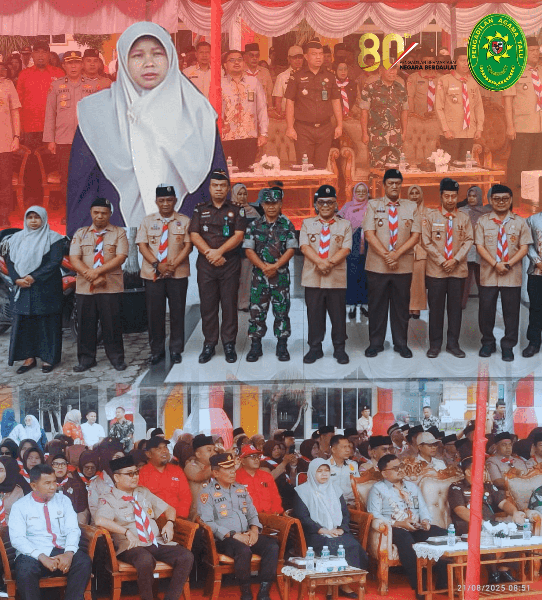 PASAMAN BARAT – Ketua Pengadilan Agama (PA) Talu, Milda Sukmawati, S.H.I., turut serta dalam perayaan Hari Pramuka ke-64 yang diselenggarakan di halaman Kantor Bupati Pasaman Barat pada Kamis, 21 Agustus 2025. Kehadiran beliau memenuhi undangan dari Kwartir Cabang (Kwarcab) Gerakan Pramuka Pasaman Barat dalam rangka Apel Besar Hari Pramuka ke-64 tahun 2025.