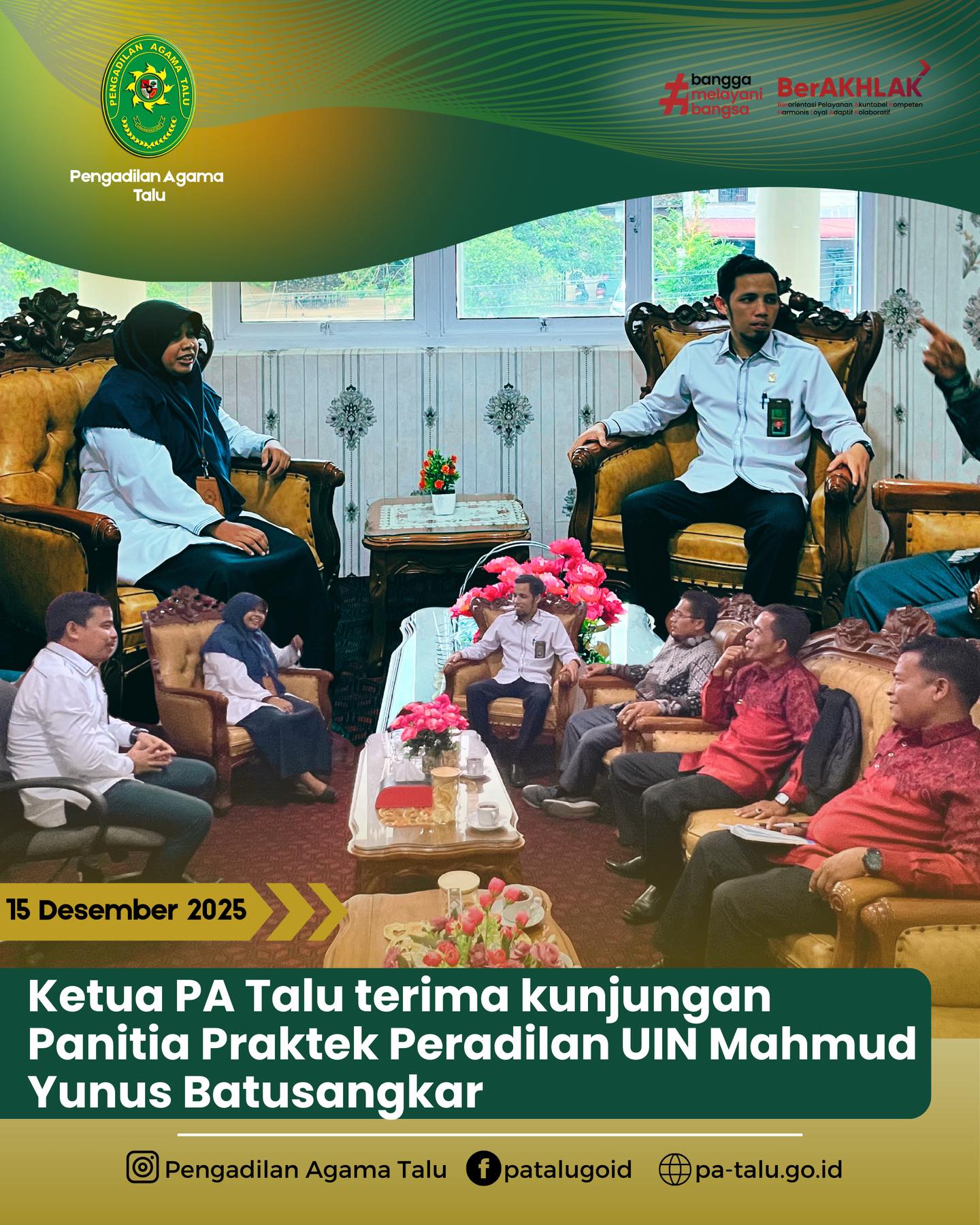 Simpang Empat, Ketua Pengadilan Agama Talu, Milda Sukmawati, S.H.I., menerima kunjungan perwakilan dari Universitas Islam Negeri (UIN) Mahmud Yunus Batusangkar dalam rangka koordinasi rencana pelaksanaan Praktik Peradilan bagi mahasiswa, yang direncanakan akan diselenggarakan pada Januari 2026. Pertemuan tersebut berlangsung di Ruang Tamu Ketua PA Talu dan bertujuan untuk membahas mekanisme, waktu pelaksanaan, serta bentuk kegiatan praktik peradilan yang akan diikuti oleh mahasiswa UIN Mahmud Yunus Batusangkar. Melalui kegiatan ini, diharapkan mahasiswa dapat memperoleh pemahaman langsung mengenai praktik peradilan, khususnya di lingkungan peradilan agama.
