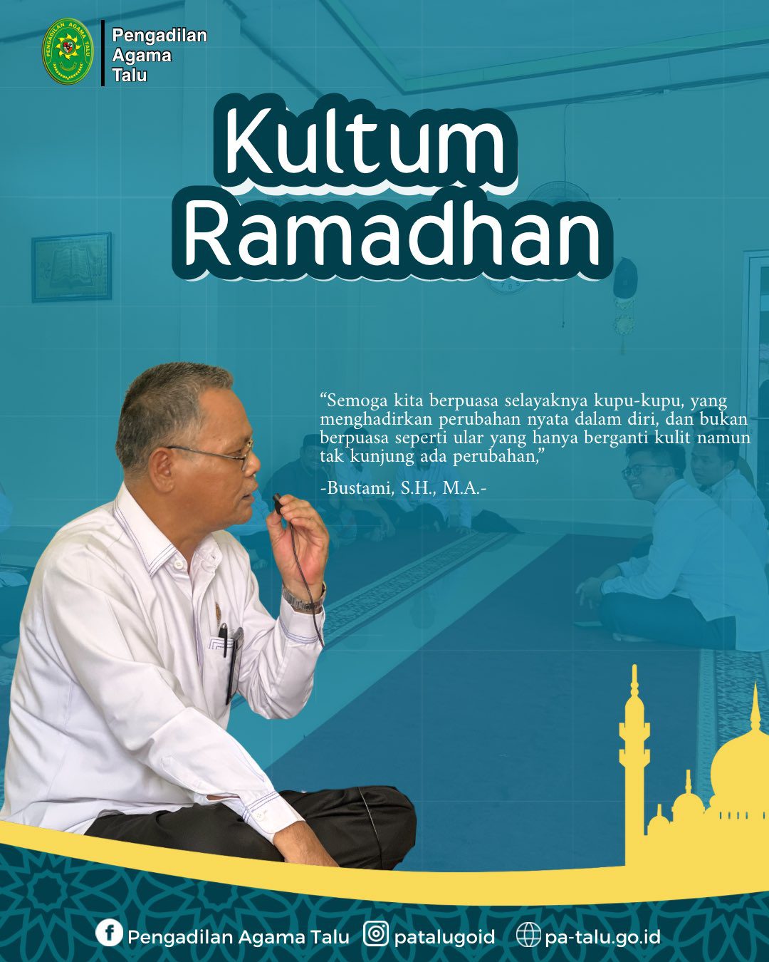 Suasana Mushala Al-Mizan Pengadilan Agama Talu saat Ramadhan dipenuhi kekhusyukan saat Panitera Pengganti Bustami, S.H., M.H., menyampaikan ceramah kultum kepada para aparatur dan jamaah yang hadir. Dalam tausiyahnya, beliau mengajak seluruh hadirin untuk memaknai puasa tidak sekadar sebagai kewajiban ritual, tetapi sebagai proses perubahan diri yang nyata. Mengawali ceramahnya, Bustami menjelaskan bahwa secara harfiah puasa berarti menahan. Sementara menurut istilah syariat, puasa adalah menahan diri dari segala sesuatu yang membatalkan puasa sejak terbit fajar hingga terbenam matahari. Namun demikian, beliau menekankan bahwa esensi puasa tidak berhenti pada menahan lapar dan dahaga semata, melainkan juga menahan hawa nafsu, amarah, serta perilaku yang tidak mencerminkan akhlak seorang muslim.