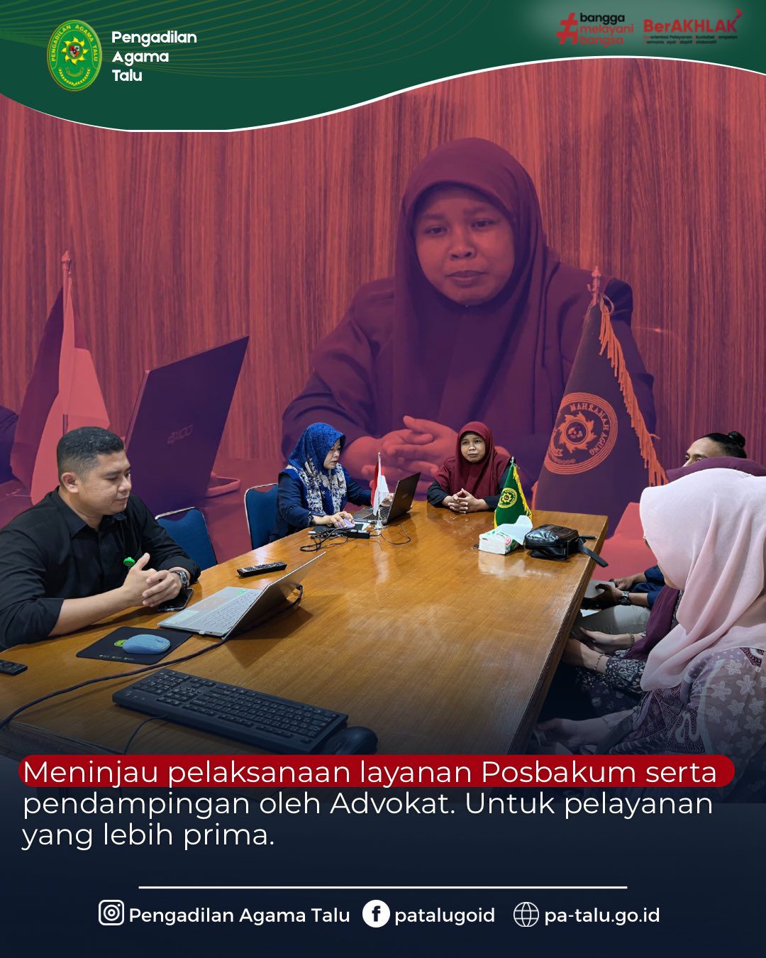 Rabu, 25 Februari 2026 telah dilaksanakan kegiatan Monitoring dan Evaluasi (Monev) Advokasi dan Pendampingan Posbakum LKKBH UIN Bukittinggi Triwulan I di Pengadilan Agama Talu. Monev dipimpin oleh Ketua PA Talu Milda Sukmawati, S.H.I., didampingi oleh Panitera Dr. Roni Pebrianto, S.H.I., M.H., dan Sekretaris Adriyeni, S.H. Kegiatan ini bertujuan untuk meninjau pelaksanaan layanan advokasi dan pendampingan hukum kepada masyarakat pencari keadilan, serta memastikan seluruh layanan berjalan sesuai dengan ketentuan dan standar pelayanan yang berlaku.