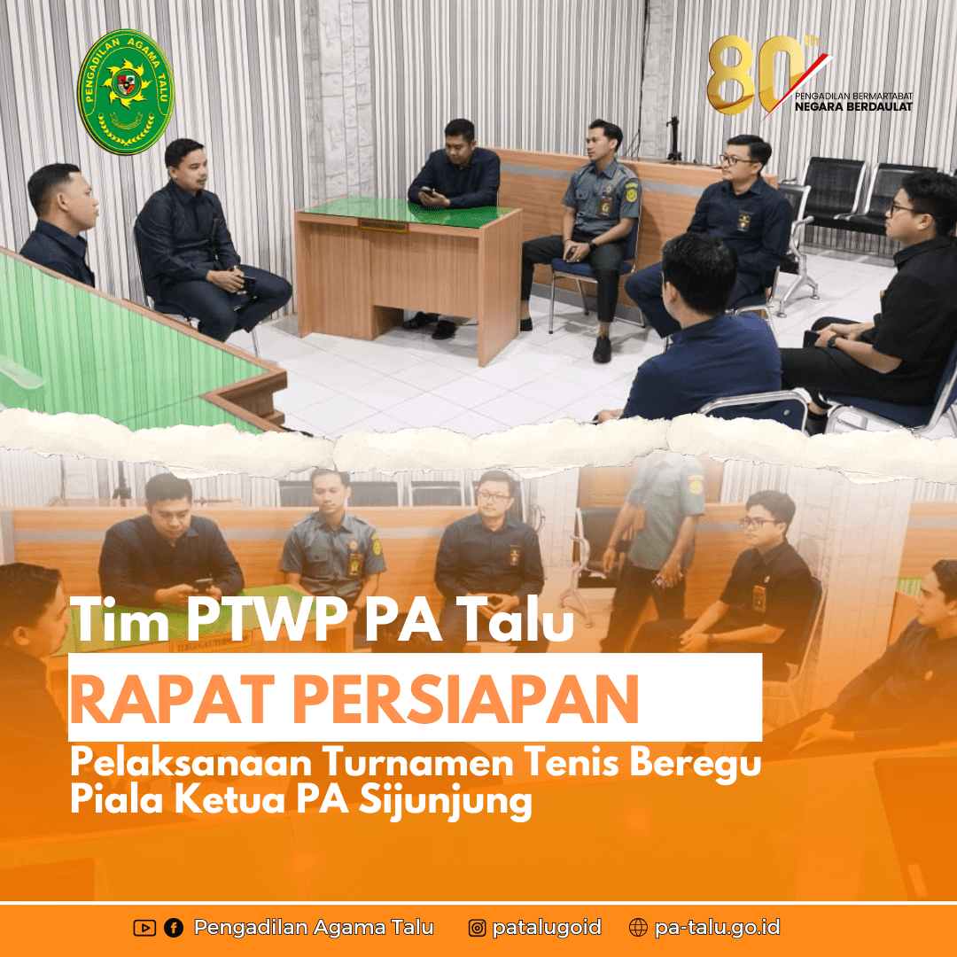 Gairah olahraga di lingkungan Pengadilan Agama (PA) Talu semakin terasa. Bertempat di Ruang Sidang 1, Tim Persatuan Tenis Warga Peradilan (PTWP) PA Talu menggelar rapat persiapan menjelang keikutsertaan mereka dalam turnamen tenis beregu. Kompetisi ini akan memperebutkan Piala Ketua Pengadilan Agama Sijunjung dan dijadwalkan berlangsung pada 10 hingga 11 Agustus mendatang.