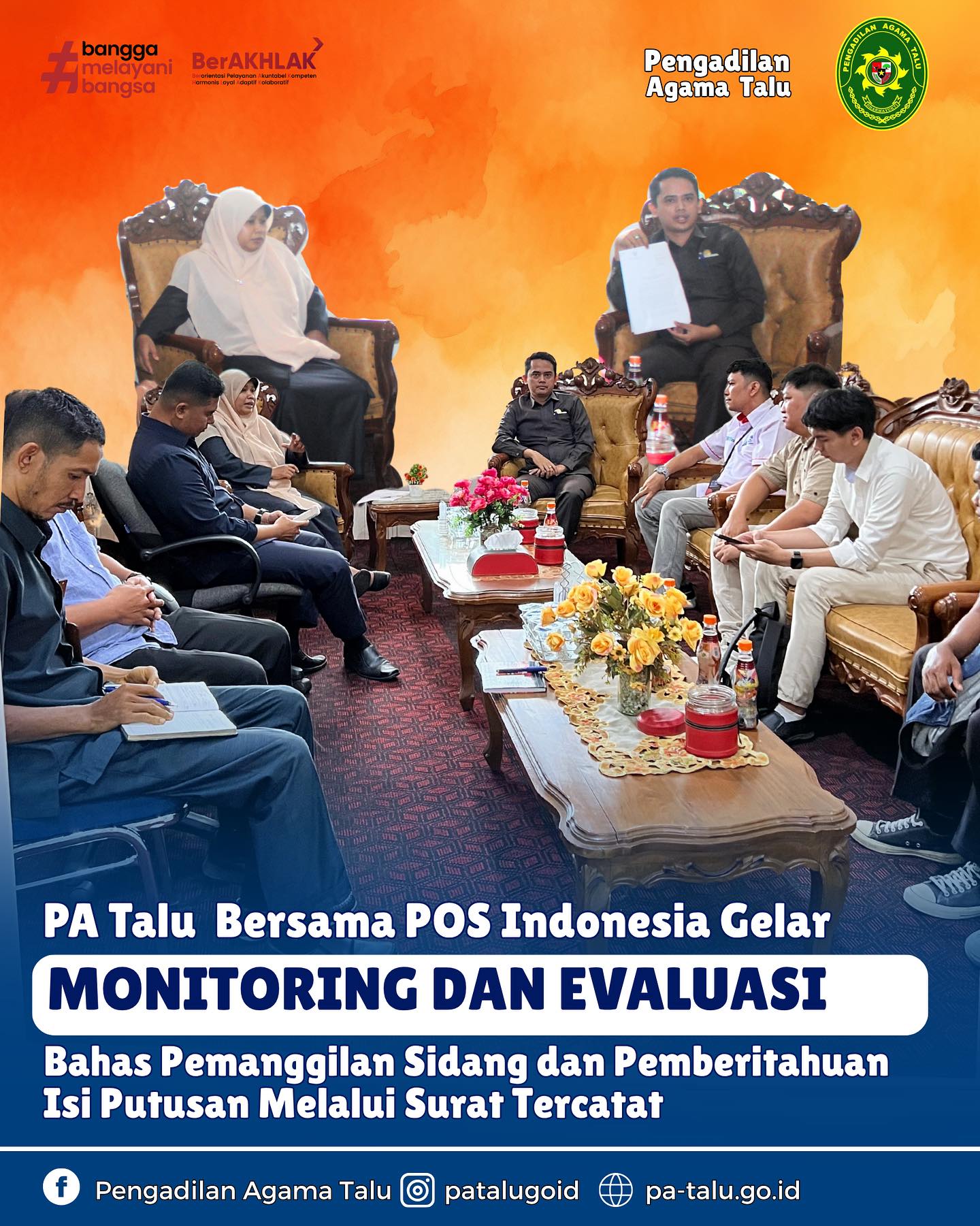 Dalam rangka meningkatkan kualitas pelayanan peradilan kepada masyarakat, Pengadilan Agama (PA) Talu menggelar rapat monitoring dan evaluasi (Monev) bersama PT POS Indonesia. Pertemuan ini membahas secara khusus pelaksanaan pemanggilan sidang dan pemberitahuan isi putusan melalui surat tercatat, yang menjadi bagian penting dalam proses administrasi peradilan.