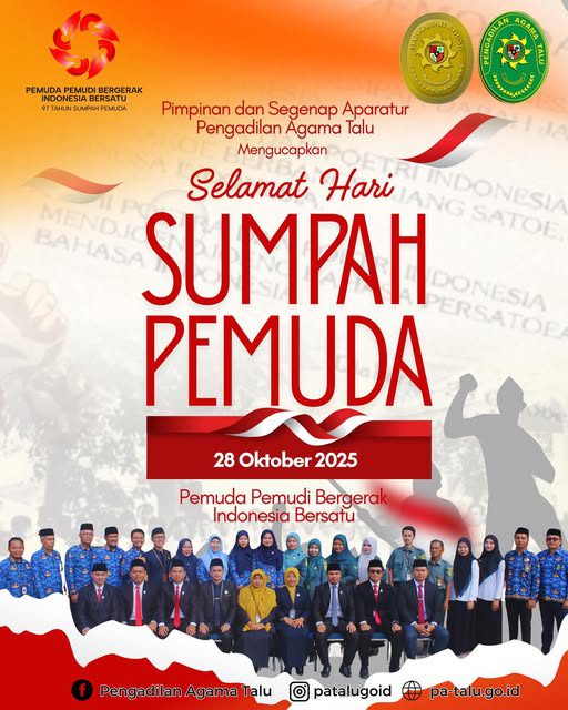 Pengadilan Agama (PA) Talu melaksanakan upacara peringatan Hari Sumpah Pemuda ke-97 di halaman kantor PA Talu. Upacara berlangsung dengan khidmat dan penuh semangat kebangsaan, diikuti oleh seluruh aparatur Pengadilan Agama Talu.