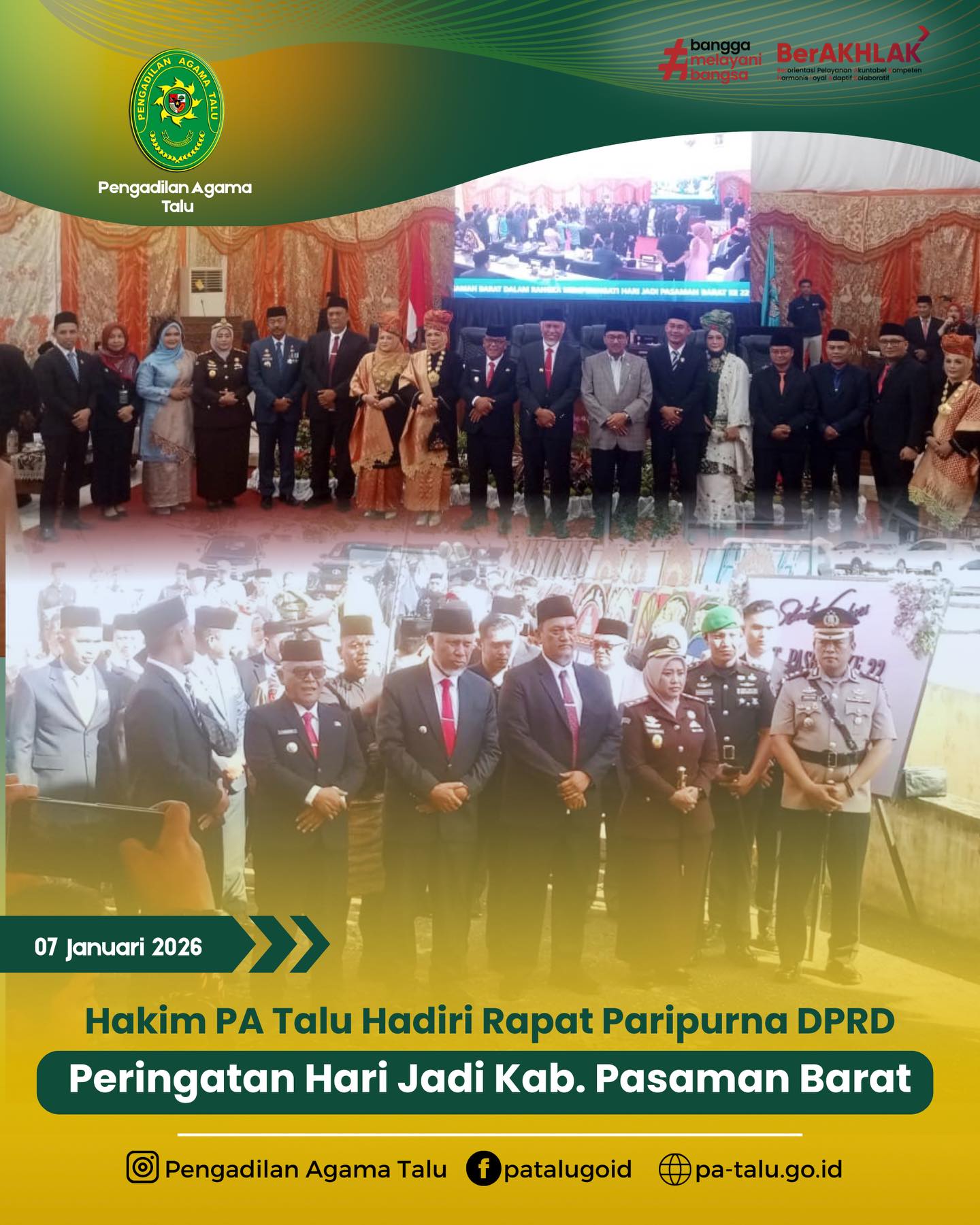 Rabu, 7 Januari 2025, Pengadilan Agama (PA) Talu yang diwakili oleh Hakim Marfiyunaldi, menghadiri Rapat Paripurna DPRD dalam rangka peringatan Hari Jadi ke-22 Kabupaten Pasaman Barat dengan mengusung tema “Bersatu Membangun Pasaman Barat Maju dan Sejahtera.” Kegiatan tersebut berlangsung di Gedung DPRD Pasaman Barat dan dihadiri Gubernur Sumatera Barat Mahyeldi, Bupati Pasaman Barat Yulianto, Wakil Bupati M. Ihpan, jajaran Pemerintah Daerah, anggota DPRD, unsur Forkopimda, Tokoh Masyarakat, serta para pemangku kepentingan. Rapat Paripurna dipimpin Ketua DPRD Pasaman Barat Dirwansyah.