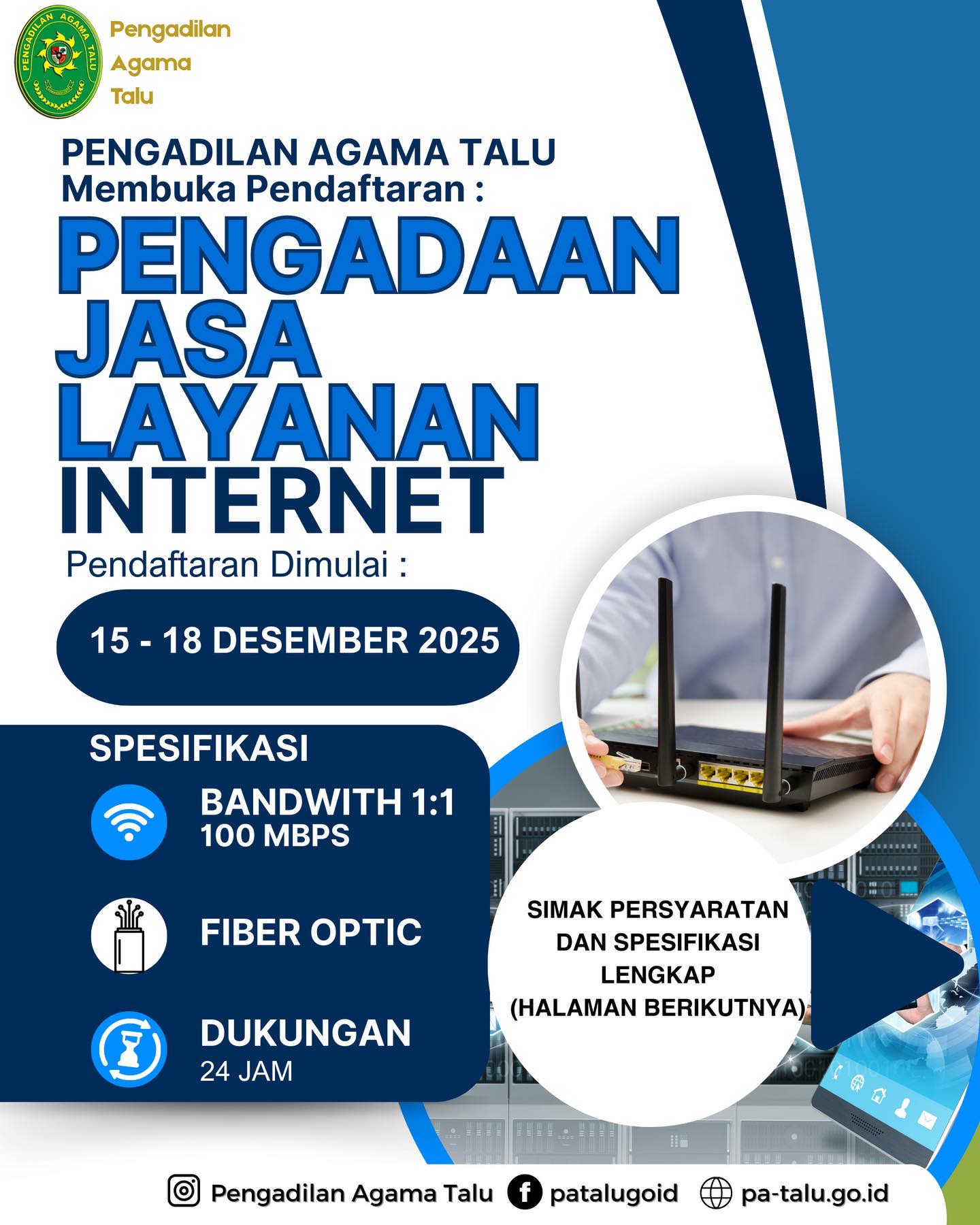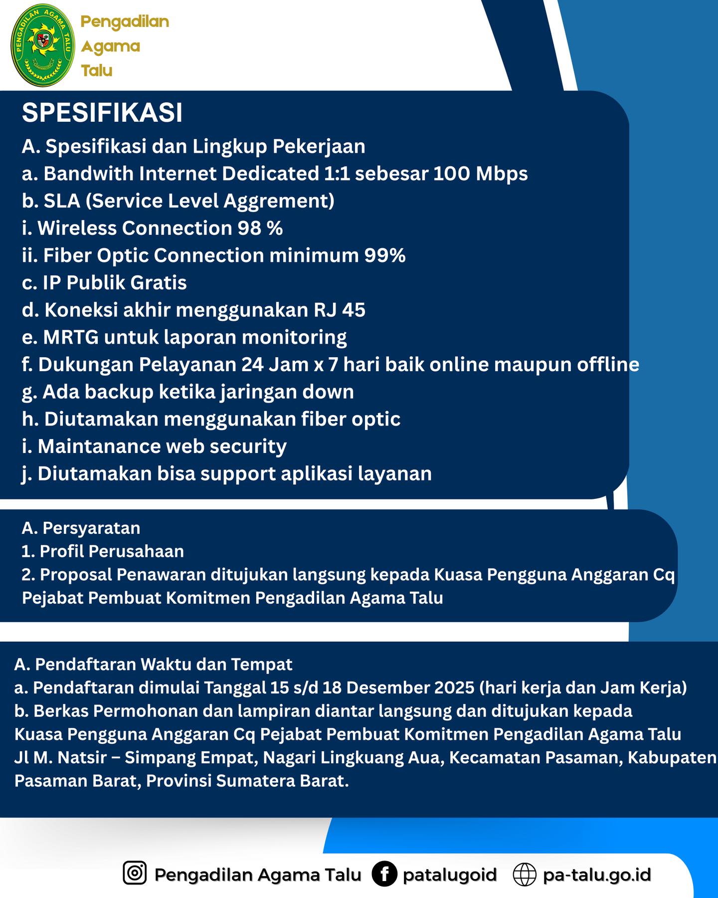 Berdasarkan Surat Pengesahan Daftar IsianPelaksanaan Anggaran (DIPA) Pengadilan Agama TaluNomor : SP-DIPA 005.01.2.0402035/2026 Tanggal 01 Desember 2025, dengan ini Pengadilan Agama Talu, Membuka Pendaftaran Pengadaan Layanan Jasa Internet Tahun Anggaran 2026 dengan Ketentuan sebagaimana terlampir. Pendaftaran dibuka tanggal 15-18 Desember 2025.