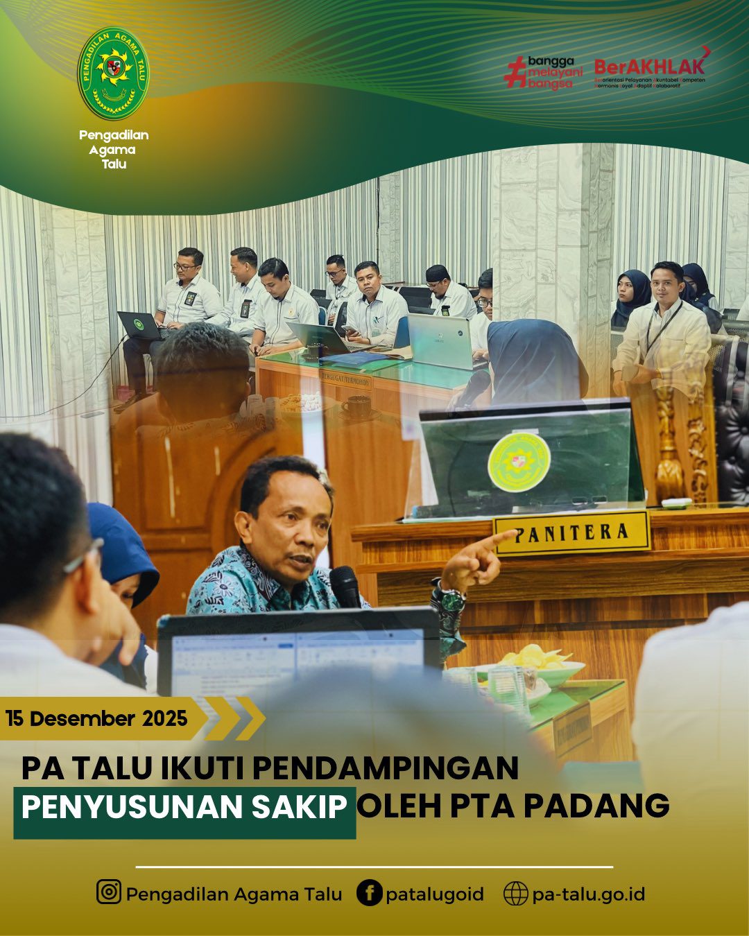 Senin, 15 Desember 2025, Ketua Pengadilan Agama (PA) Talu Milda Sukmawati, Hakim, Sekretaris Adriyeni, Panitera Roni Pebrianto dan Aparatur PA Talu mengikuti Pendampingan Penyusunan SAKIP (Sistem Akuntabilitas Kinerja Instansi Pemerintah) oleh Pengadilan Tinggi Agama (PTA) Padang yang dilaksanakan di Ruang Sidang Utama PA Talu. Kegiatan ini dibina langsung oleh Sekretaris PTA Padang, Dr. Irsyadi, S.Ag., M.Ag. Didampingi oleh Kabag Umum, Ismail, S.H.I., M.A. dan Arya Jaya Shentika. S.H.