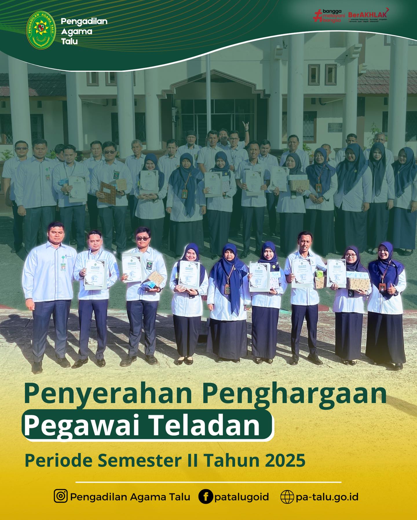 Pengadilan Agama Talu melaksanakan kegiatan Pemberian Penghargaan Pegawai Teladan Semester II Tahun 2025 sebagai bentuk apresiasi atas dedikasi, integritas, dan kinerja terbaik aparatur peradilan. Kegiatan ini dilaksanakan berdasarkan Keputusan Ketua Pengadilan Agama Talu Nomor 114/KPA.W3-A14/SK.KP5.8/I/2026. Pemberian penghargaan ini merupakan bagian dari upaya mendorong peningkatan kinerja aparatur serta sebagai implementasi nyata dari reformasi birokrasi, khususnya dalam membangun budaya kerja yang profesional, berintegritas, dan berorientasi pada pelayanan prima. Adapun pegawai yang menerima penghargaan pada periode semester kedua tahun 2025 adalah sebagai berikut :