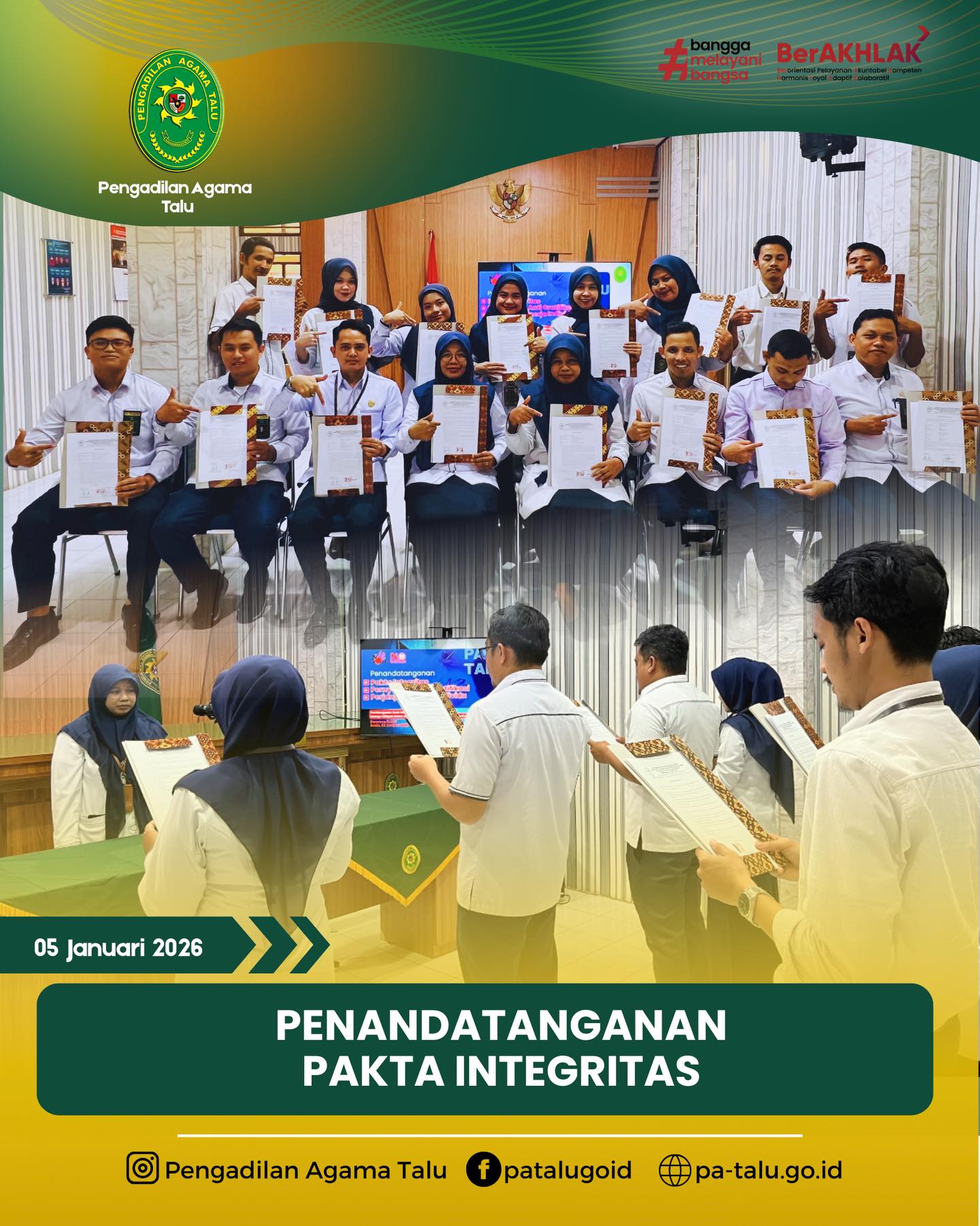 Pengadilan Agama (PA) Talu melaksanakan kegiatan penandatanganan Pakta Integritas pada hari Senin, 5 Januari 2026. Acara penting ini bertempat di Ruang Sidang Utama PA Talu dan merupakan komitmen seluruh jajaran untuk mewujudkan pelayanan peradilan yang bersih, transparan, dan akuntabel. Kegiatan ini dipimpin langsung oleh Ketua PA Talu, Milda Sukmawati, S.H.I.. Pakta Integritas ditandatangani oleh seluruh elemen PA Talu, mulai dari para Hakim, seluruh pegawai di bagian Kepaniteraan, hingga pegawai pada bagian Kesekretariatan. Penandatanganan ini menandai kesiapan PA Talu untuk memperkuat zona integritas menuju Wilayah Bebas dari Korupsi (WBK) dan Wilayah Birokrasi Bersih dan Melayani (WBBM).