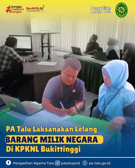 Pengadilan Agama Talu hadiri pelaksanaan Lelang Barang Milik Negara di Kantor Pelayanan Kekayaan Negara dan Lelang (KPKNL) Bukittinggi. Lelang di ikuti oleh Sekretaris Adriyeni, S.H., didampingi Plt. Kasubag Umum dan Keuangan Diqki Aulia, S. Kom, dan Pranata Keuangan APBN Pratiwi P, A.Md.