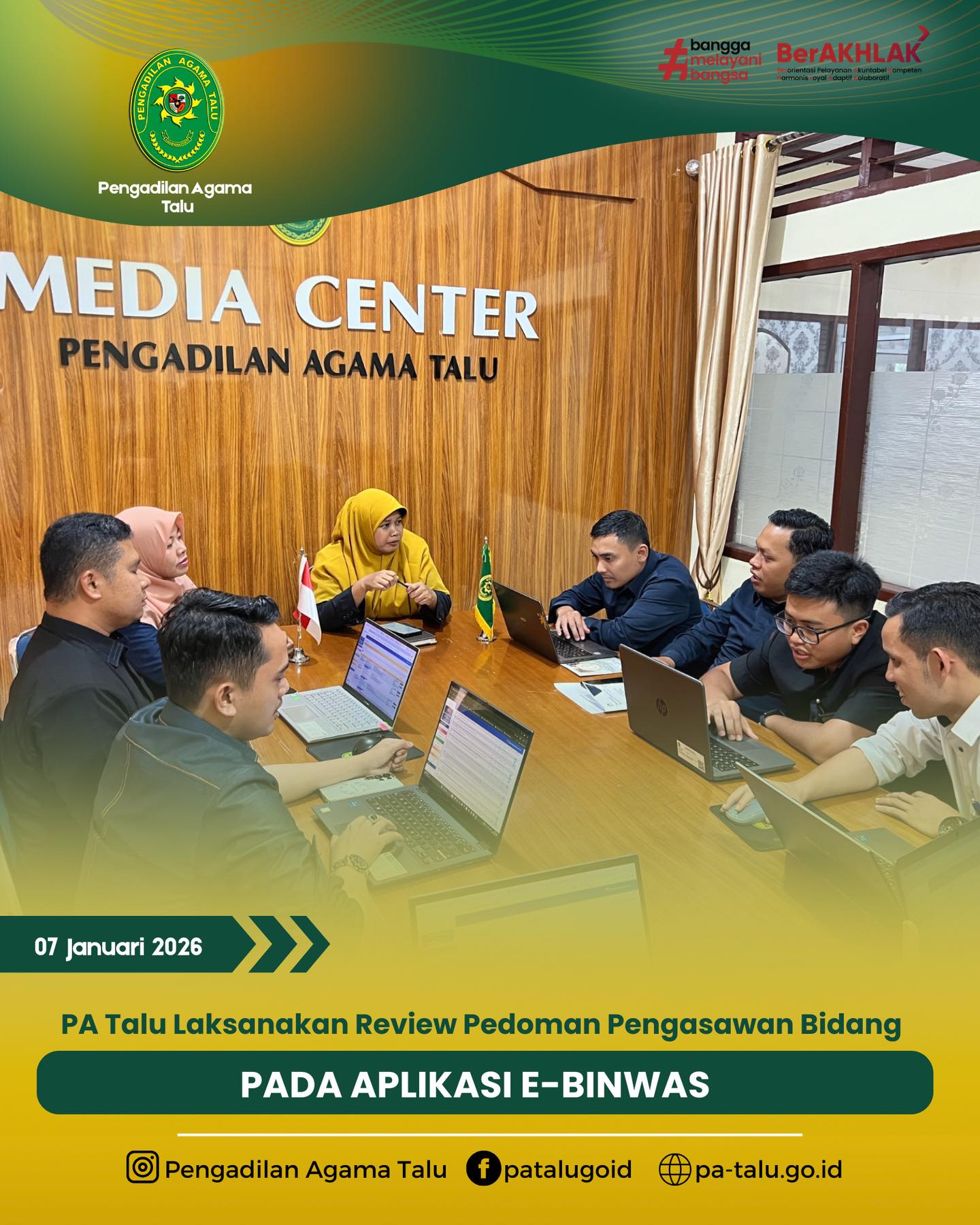 Pada hari Rabu, tanggal 7 Januari 2026, bertempat di Media Center Pengadilan Agama Talu, dilaksanakan kegiatan review pedoman pengawasan bidang dan pengawasan daerah sebagai tindak lanjut Surat Direktorat Jenderal Badan Peradilan Agama Mahkamah Agung Republik Indonesia Nomor 3481/DJA/PW1.1/XII/2025 tanggal 10 Desember 2025 tentang Permohonan Review Pedoman Pengawasan Bidang dan Pengawasan Daerah pada Aplikasi E-BINWAS. Kegiatan review ini dipimpin oleh Ketua Pengadilan Agama Talu dan diikuti oleh para hakim, panitera, serta sekretaris. Kegiatan dilaksanakan sehubungan dengan adanya masukan dalam implementasi pengawasan bidang dan pengawasan daerah secara elektronik terintegrasi melalui aplikasi E-BINWAS, sehingga diperlukan penyempurnaan terhadap pedoman pengawasan yang digunakan di lingkungan peradilan agama.