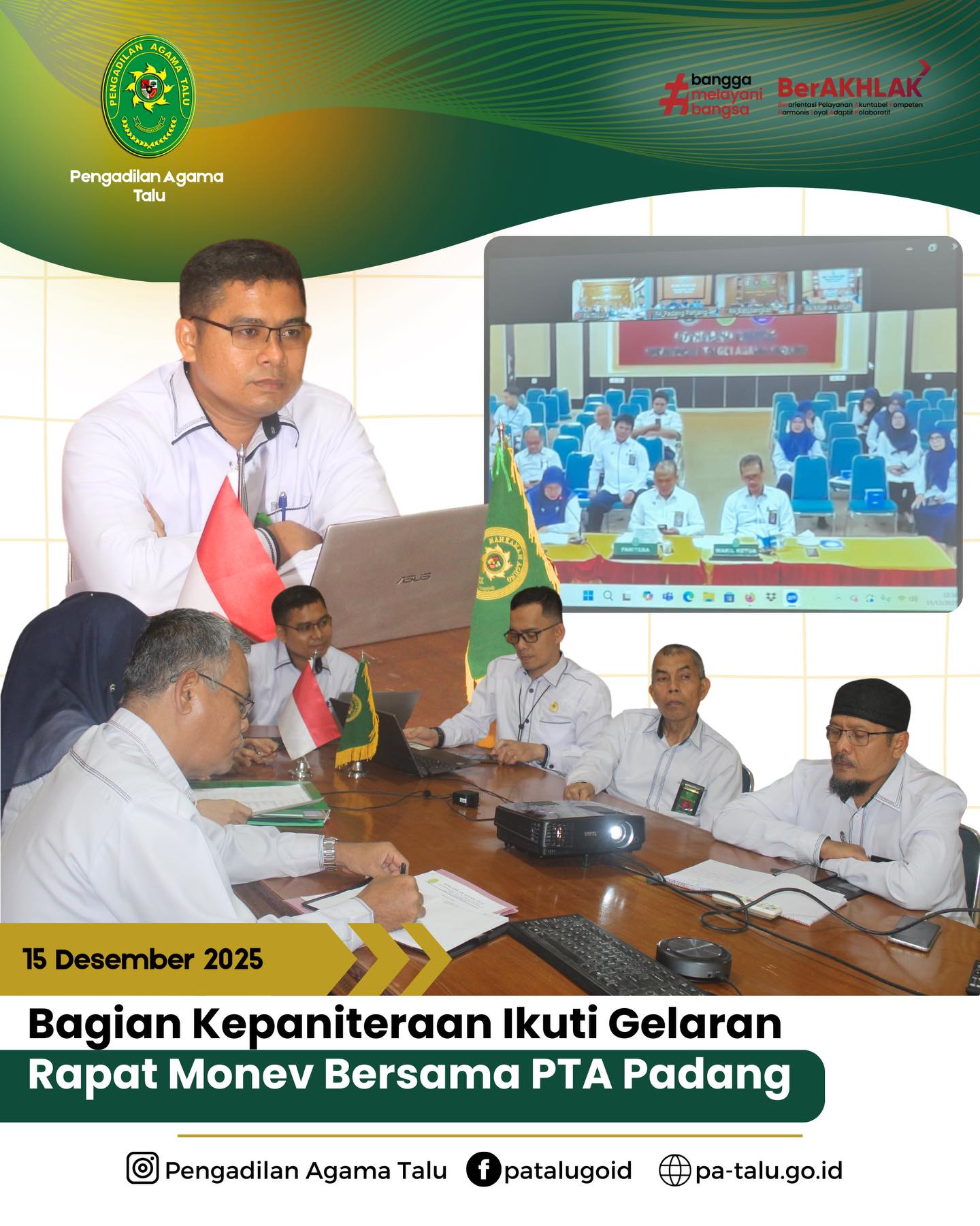 Pengadilan Tinggi Agama Padamg (PTA Padang) menyelenggarakan Rapat Monitoring dan Evaluasi (Monev) Kepaniteraan Pengadilan Agama se-wilayah PTA Padang Tahun 2025 pada hari Senin dan Selasa tanggal 15 dan 16 Desember 2025. Kegiatan ini dilaksanakan secara daring melalui Zoom Meeting dan diikuti oleh Panitera, Panitera Muda, serta Panitera Pengganti Pengadilan Agama Talu. Rapat monev tersebut membahas secara khusus hasil temuan Hakim Pengawas Pengadilan Tinggi Agama Padang pada satuan kerja Pengadilan Agama di wilayah hukum Pengadilan Tinggi Agama Padang. Dalam rapat ini, masing-masing temuan dipaparkan dan dianalisis untuk selanjutnya ditindaklanjuti oleh kepaniteraan sesuai dengan ketentuan dan standar operasional prosedur yang berlaku.
