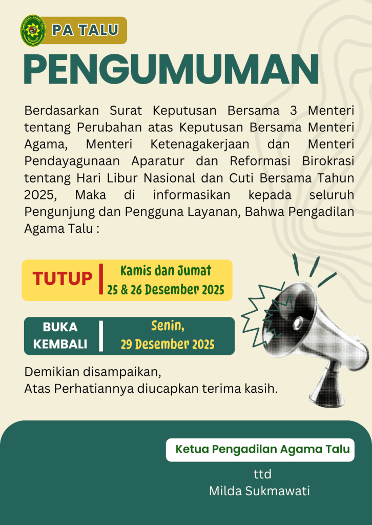 Berdasarkan Surat Keputusan Bersama 3 Menteri tentang Perubahan atas Keputusan Bersama Menteri Agama, Menteri Ketenagakerjaan dan Menteri Pendayagunaan Aparatur dan Reformasi Birokrasi tentang Hari Libur Nasional dan Cuti Bersama Tahun 2025, Maka di informasikan sebagai berikut :