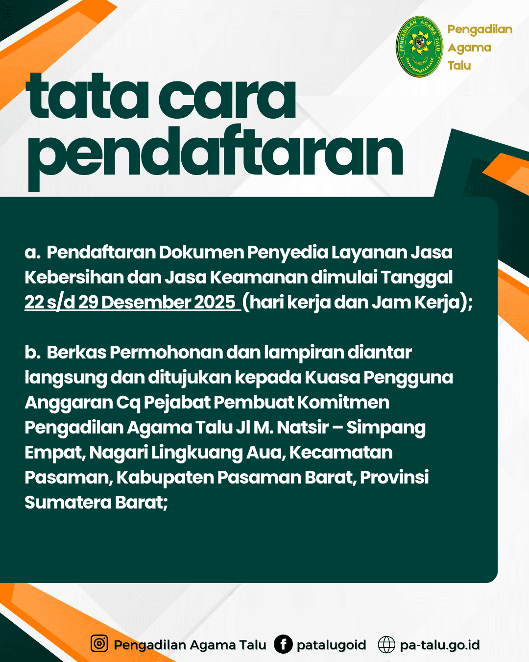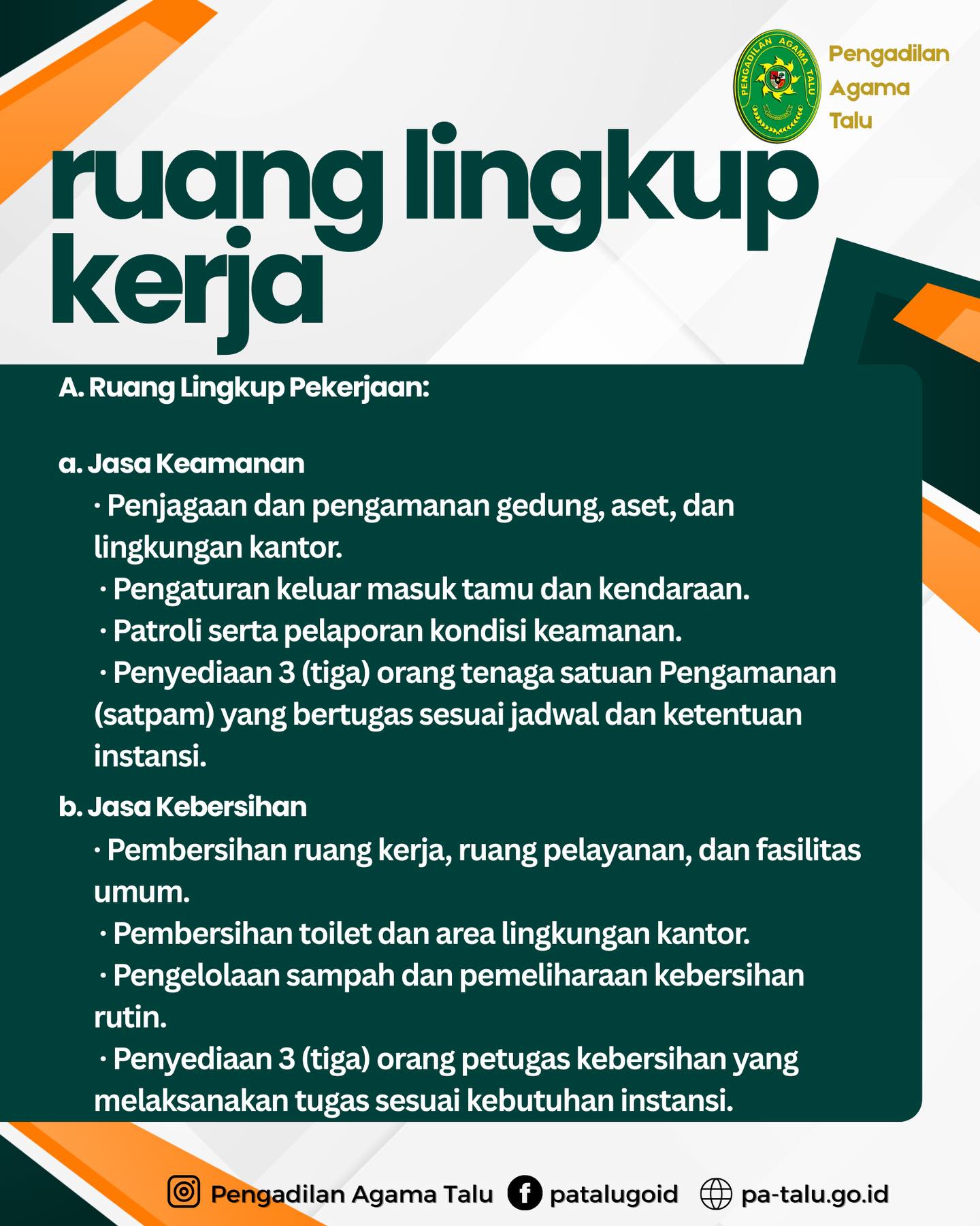 Dalam rangka mendukung kelancaran pelaksanaan tugas dan fungsi serta menciptakan lingkungan kerja yang aman, tertib, dan nyaman. Pengadilan Agama Talu melaksanakan Pengadaan Jasa Keamanan dan Kebersihan.
