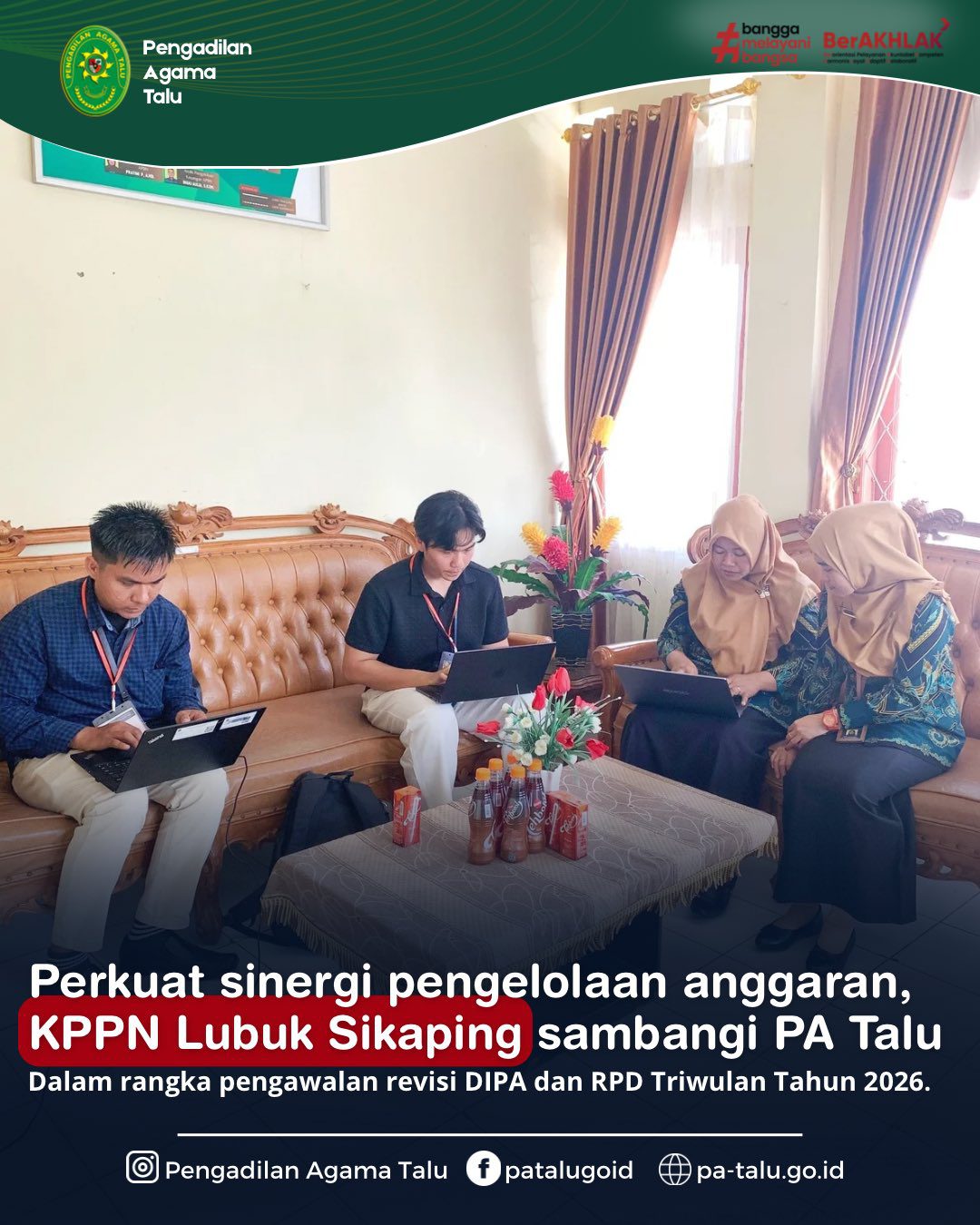 Simpang Empat, Langkah proaktif dalam menjaga kualitas belanja negara kembali ditunjukkan oleh Pengadilan Agama (PA) Talu. Pada Kamis, 12 Februari 2026, PA Talu menerima kunjungan koordinasi dari tim Kantor Pelayanan Perbendaharaan Negara (KPPN) Lubuk Sikaping guna memastikan performa anggaran Triwulan I tahun 2026 tetap berada di jalur yang tepat. Kunjungan tim KPPN ini disambut langsung oleh Sekretaris PA Talu, Adriyeni, S.H., didampingi oleh Bendahara Pengeluaran, Pratiwi Permatasari, S.A.B. di ruang kerja Sekretaris PA Talu. Pertemuan ini berlangsung hangat namun sarat dengan pembahasan teknis mengenai efektivitas pengelolaan keuangan di awal tahun anggaran.
