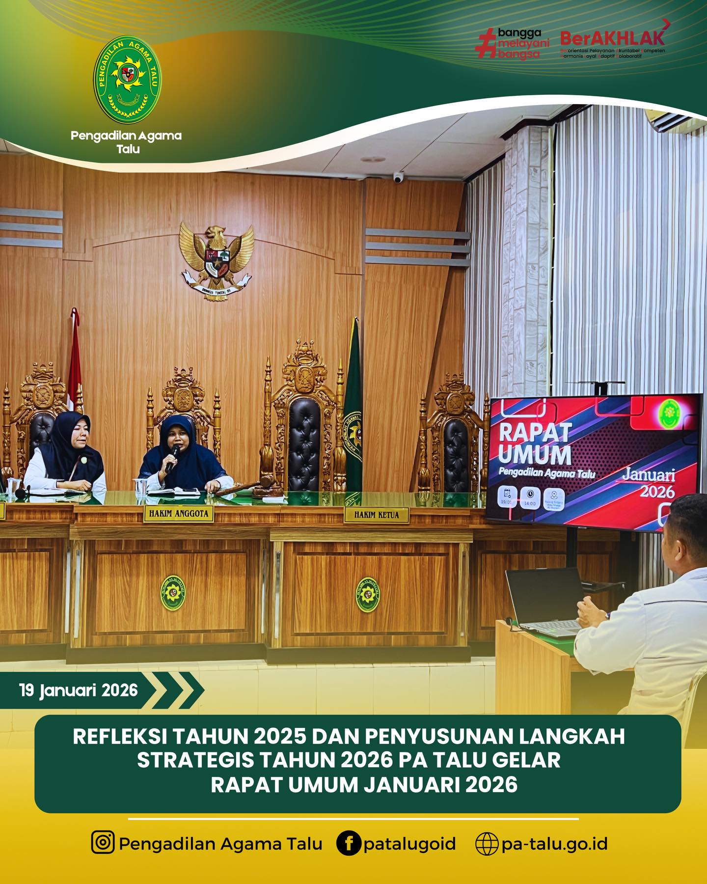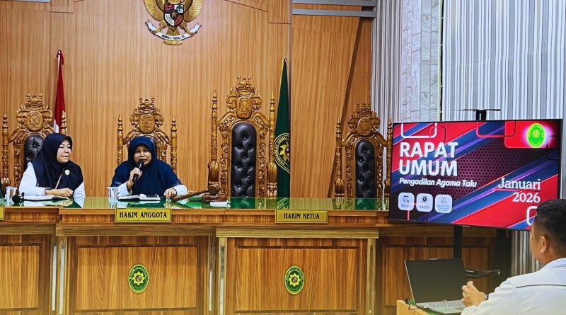 Rapat bulanan Pengadilan Agama Talu dilaksanakan pada Senin, 19 Januari 2026, bertempat di ruang sidang utama Pengadilan Agama Talu. Kegiatan ini diikuti oleh seluruh aparatur Pengadilan Agama Talu dengan masih dibaluti suasana semangat awal tahun. Rapat dipimpin langsung oleh Ketua Pengadilan Agama Talu dan bertujuan untuk melakukan evaluasi terhadap pelaksanaan tugas dan kinerja pada bulan sebelumnya, sekaligus menyusun langkah-langkah strategis untuk peningkatan kinerja dan kualitas pelayanan pada bulan berikutnya. Dalam rapat tersebut dibahas berbagai hal penting, antara lain capaian kinerja pada tahun 2025 yang diuraikan oleh masing-masing bagian, peningkatan kedisiplinan aparatur, evaluasi draft penilaian kinerja triwulan IV tahun 2025 dan penguatan komitmen bersama pembangunan Zona Integritas Pengadilan Agama Talu menuju WBK di tahun 2026 ini. Rapat bulanan ini diharapkan dapat menjadi sarana koordinasi dan evaluasi yang efektif, sehingga seluruh program kerja Pengadilan Agama Talu dapat terlaksana dengan baik guna mendukung terwujudnya peradilan yang agung, transparan, dan akuntabel.