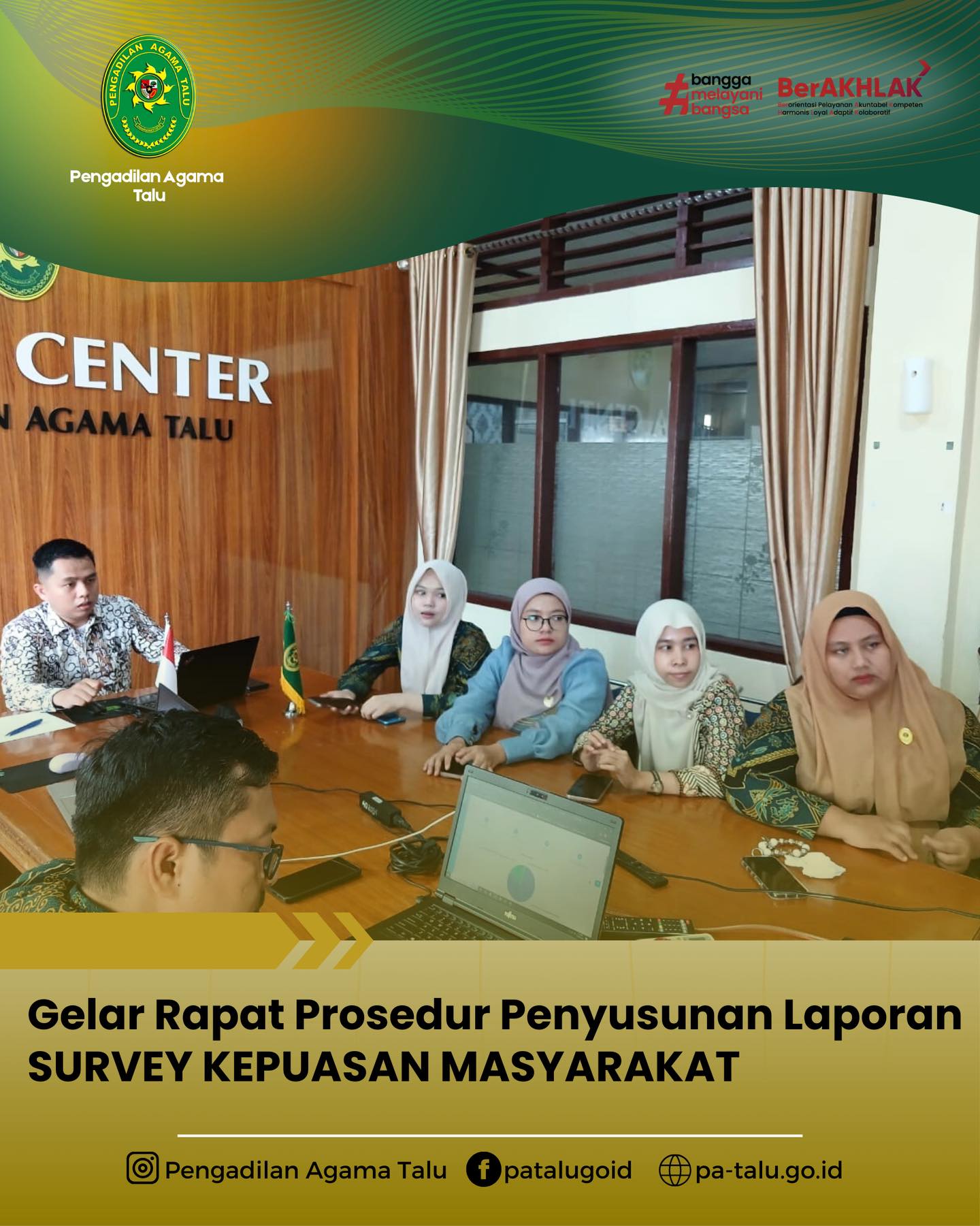 Rapat tersebut membahas prosedur pembuatan dan penyusunan laporan SKM sebagai instrumen evaluasi terhadap kualitas pelayanan publik. Dalam rapat tersebut dibahas tahapan penyusunan laporan SKM, mulai dari pengumpulan data responden, pengolahan hasil survei, hingga penyusunan laporan akhir sesuai dengan pedoman dan ketentuan yang berlaku. Melalui kegiatan ini, diharapkan seluruh anggota Tim SKM memiliki pemahaman yang seragam terkait mekanisme penyusunan laporan SKM sehingga hasil survei dapat dimanfaatkan secara optimal sebagai dasar peningkatan kualitas pelayanan di Pengadilan Agama Talu.