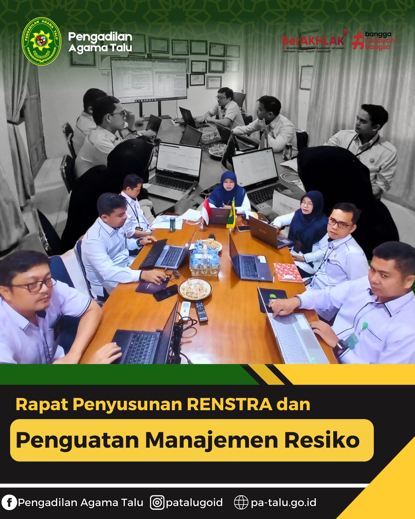 Pengadilan Agama Talu melaksanakan rapat internal dalam rangka penyusunan Rencana Strategis (Renstra) dan penguatan Manajemen Risiko sebagai bagian dari upaya memastikan tata kelola lembaga yang semakin adaptif, profesional, dan berorientasi pada pelayanan publik yang berkualitas. Rapat ini sebelumnya telah dilaksanakan pada tanggal 24 November 2025 dan dilanjutkan pada hari ini yang diikuti oleh pimpinan, pejabat struktural, serta seluruh unsur terkait untuk menyelaraskan arah kebijakan, sasaran strategis, dan langkah mitigasi risiko yang mungkin muncul dalam pelaksanaan tugas pelayanan peradilan. Setiap bagian berdiskusi secara mendalam mengenai tantangan, peluang, serta strategi pengembangan kinerja agar Pengadilan Agama Talu semakin responsif terhadap kebutuhan masyarakat pencari keadilan.