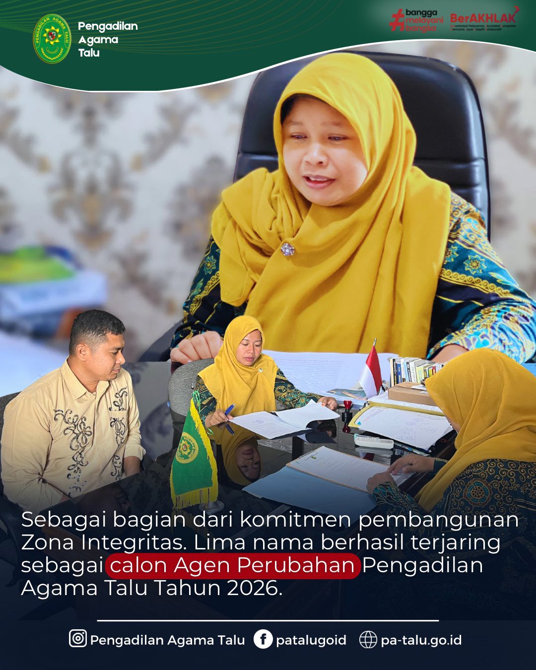 Bertempat di ruang Ketua Pengadilan Agama Talu, telah dilaksanakan rapat penjaringan nama calon Agen Perubahan dalam rangka pembangunan Zona Integritas Tahun 2026. Kegiatan ini dipimpin langsung oleh Ketua Pengadilan Agama Talu, Milda Sukmawati, S.H.I., bersama Panitera Dr. Roni Pebrianto, S.H.I., M.H., dan Sekretaris Adriyeni, S.H.