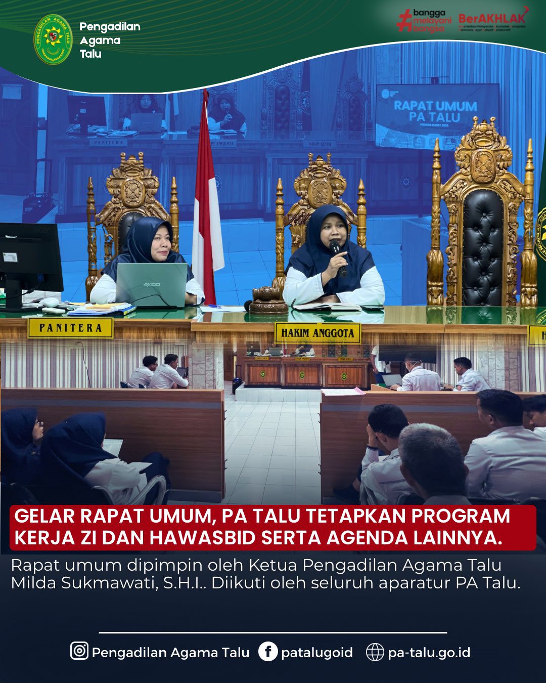 Senin, 2 Maret 2026, Pengadilan Agama Talu melaksanakan rapat umum yang diikuti seluruh aparatur Pengadilan Agama Talu. Salah satu agenda yang dibahas adalah pelaksanaan Hawasbid sebagai bentuk pengawasan dan evaluasi kinerja guna meningkatkan kualitas pelayanan. Rapat juga membahas persiapan Public Campaign sebagai agenda program kerja area I zona integritas Pengadilan Agama TALU, rencana penyusunan program kerja Pengadilan Agama Talu, serta penguatan peran Agen Perubahan sebagai motor penggerak reformasi birokrasi. Kegiatan ditutup dengan komitmen bersama untuk terus menjaga integritas dan meningkatkan pelayanan kepada masyarakat.