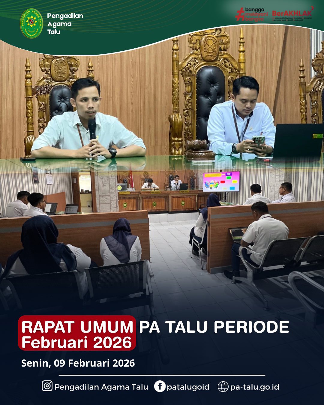Pengadilan Agama Talu menggelar rapat umum pada Senin, 09 Februari 2026, bertempat di Ruang Sidang Abu Musa Al Asy’ari. Rapat dibuka dan dipimpin oleh Plt Ketua PA Talu, Marfiyunaldi, S.H.I., M.H., selanjutnya rapat dipandu oleh Hakim Muhammad Tambusai Ad Dauly, S.H.I., M.H. dengan dihadiri seluruh aparatur. Agenda utama rapat diawali dengan pembahasan pembangunan Zona Integritas, khususnya terkait target prioritas yang akan dilaksanakan pada bulan Februari. Fokus pembahasan meliputi rencana penyelenggaraan rapat pleno penyusunan dan pengesahan program kerja, penetapan role model dan agen perubahan, serta pelaksanaan public campaign sebagai bagian dari penguatan budaya integritas di lingkungan PA Talu.