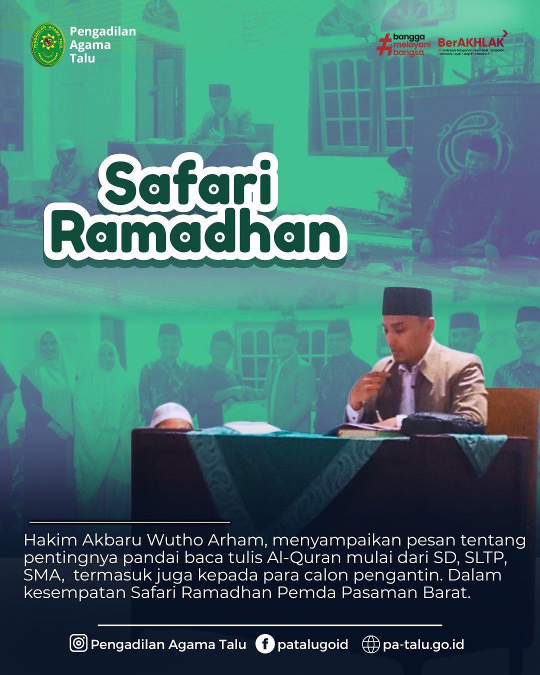 Kajai, 4 Maret 2026 – Tim Safari Ramadhan Kabupaten Pasaman Barat melaksanakan kunjungan ke Masjid Nurul Yaqin, Kampung Alang, Kajai, pada Rabu malam (04/03). Kegiatan ini berlangsung khidmat dan penuh kebersamaan bersama masyarakat setempat. Rombongan tiba di lokasi sekitar pukul 17.30 WIB dan disambut hangat oleh pengurus masjid serta masyarakat. Kegiatan diawali dengan buka puasa bersama, kemudian dilanjutkan dengan shalat Isya berjamaah sebelum memasuki rangkaian acara resmi. Tim Safari Ramadhan dipimpin oleh Pengadilan Agama Talu sebagai ketua tim, didampingi Dinas Kesehatan, Dinas Perhubungan, RSUD, Kepala Bagian Sekretariat Daerah, serta Bagian Kesejahteraan Rakyat (Kesra) Kabupaten Pasaman Barat.