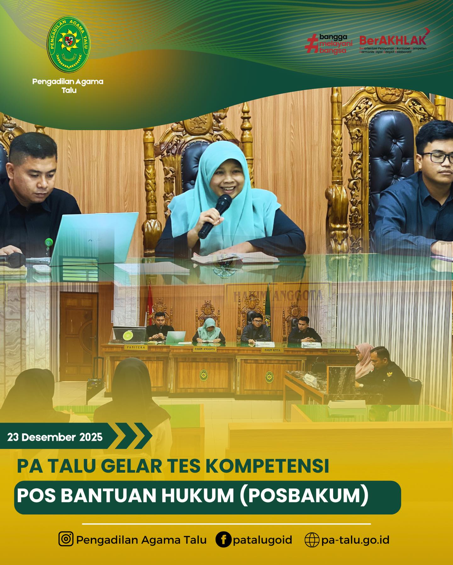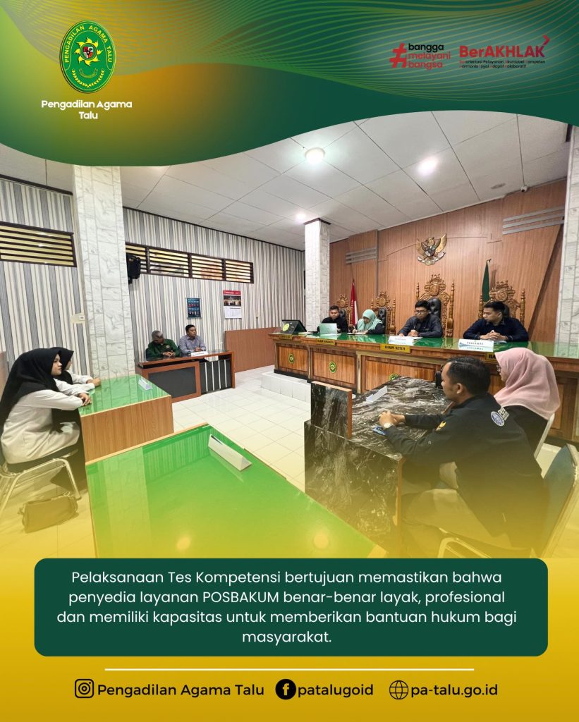 Pengadilan Agama Talu mengadakan Tes Kompetensi Pos Bantuan Hukum (Posbakum) yang secara resmi dibuka oleh Ketua Pengadilan Agama Talu, Ibu Milda Sukmawati, S.H.I. Dalam sambutannya, Ibu Ketua menyampaikan bahwa salah satu sasaran kinerja Pengadilan Agama adalah meningkatkan tingkat kepercayaan masyarakat. Hal tersebut dapat diwujudkan melalui pemberian layanan bantuan hukum yang berkualitas. Oleh karena itu, salah satu syarat bagi penyedia layanan Posbakum adalah wajib lulus ujian kompetensi.