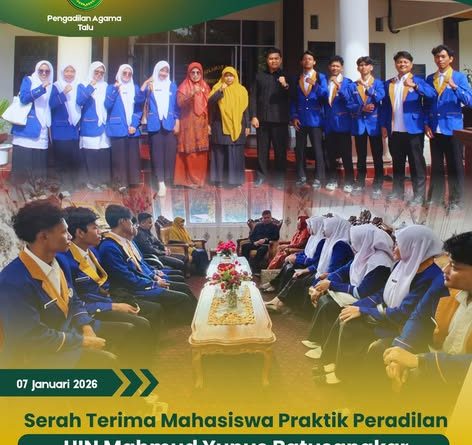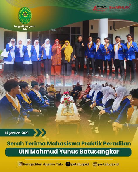 Berita Seputar PA Talu SERAH TERIMA MAHASISWA MAGANG UIN MAHMUD YUNUS BATUSANGKAR 7 Januari 2026 TIM IT PA Talu Simpang Empat, 07 Januari 2026 Pengadilan Agama Talu melaksanakan serah terima mahasiswa praktik peradilan dari UIN Mahmud Yunus Batusangkar pada Rabu, 07 Januari 2026.